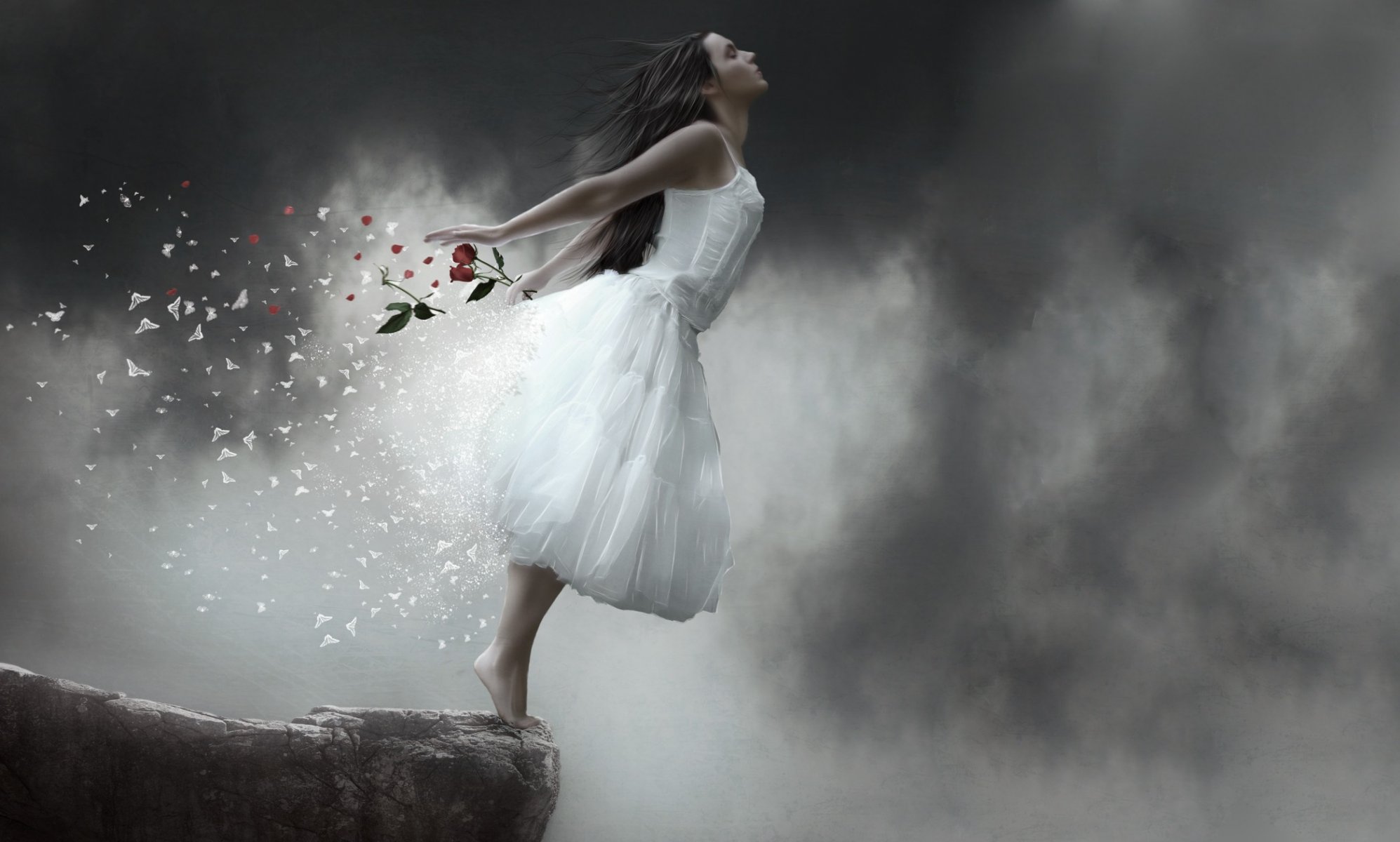 Mädchen steht am rande einer klippe vor dem hintergrund eines dunklen himmelsMädchen steht am Rande einer Klippe vor dem Hintergrund eines dunklen Himmels