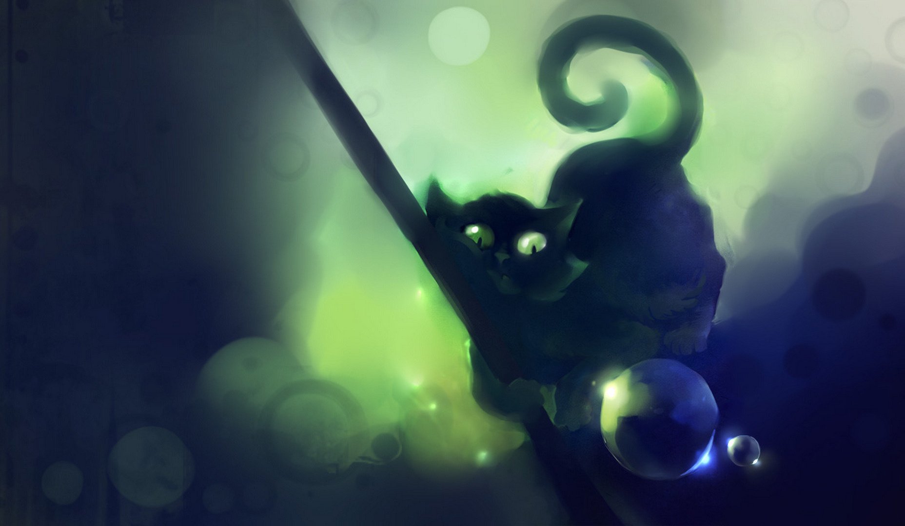Schwarze Katze mit grünen Augen und Blasen