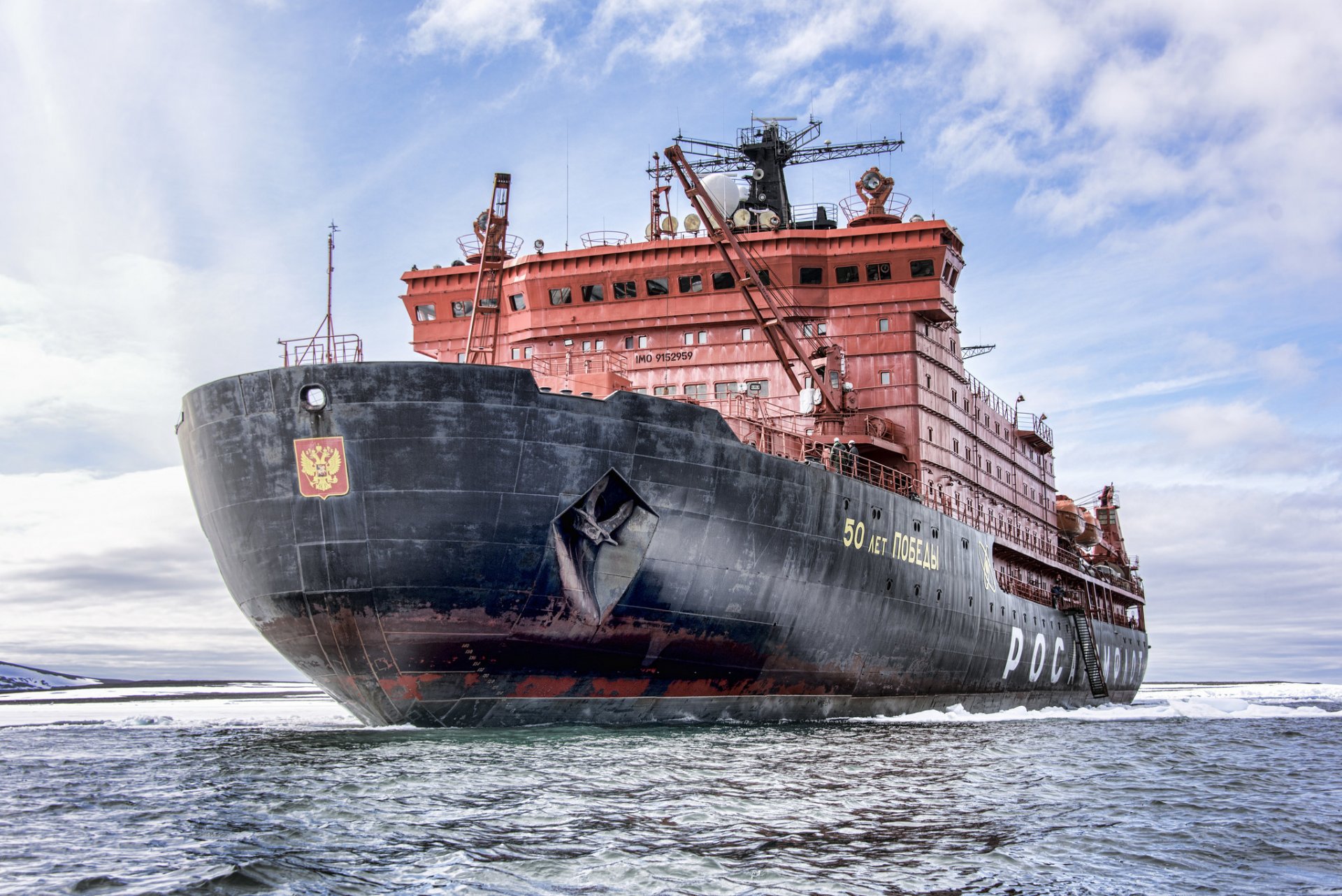 Ein riesiger eisbrecher mit dem wappen der russischen föderationEin riesiger Eisbrecher mit dem Wappen der Russischen Föderation