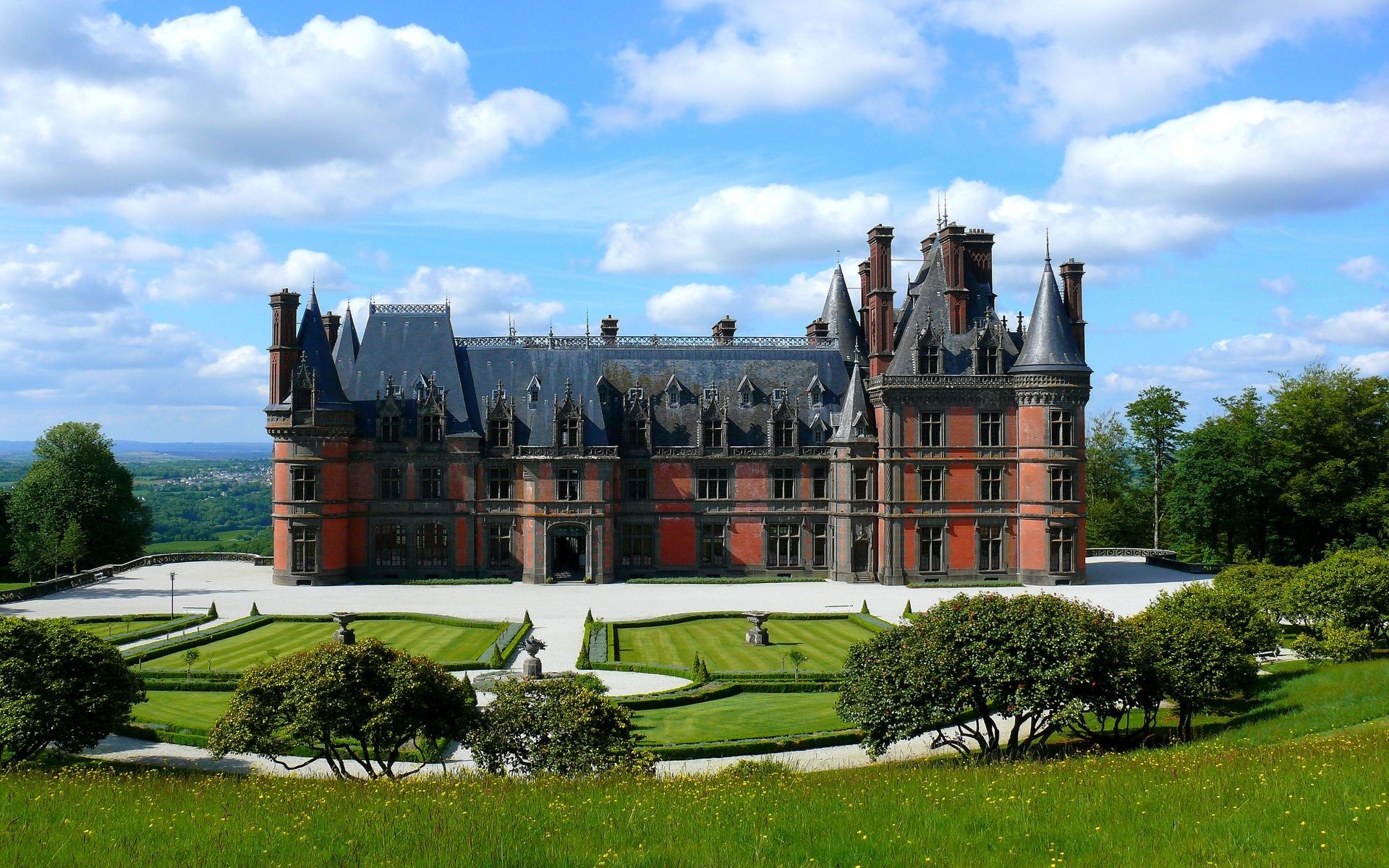 Ein schloss mit vor anker liegenden booten am uferEin Schloss mit vor anker liegenden Booten am Ufer