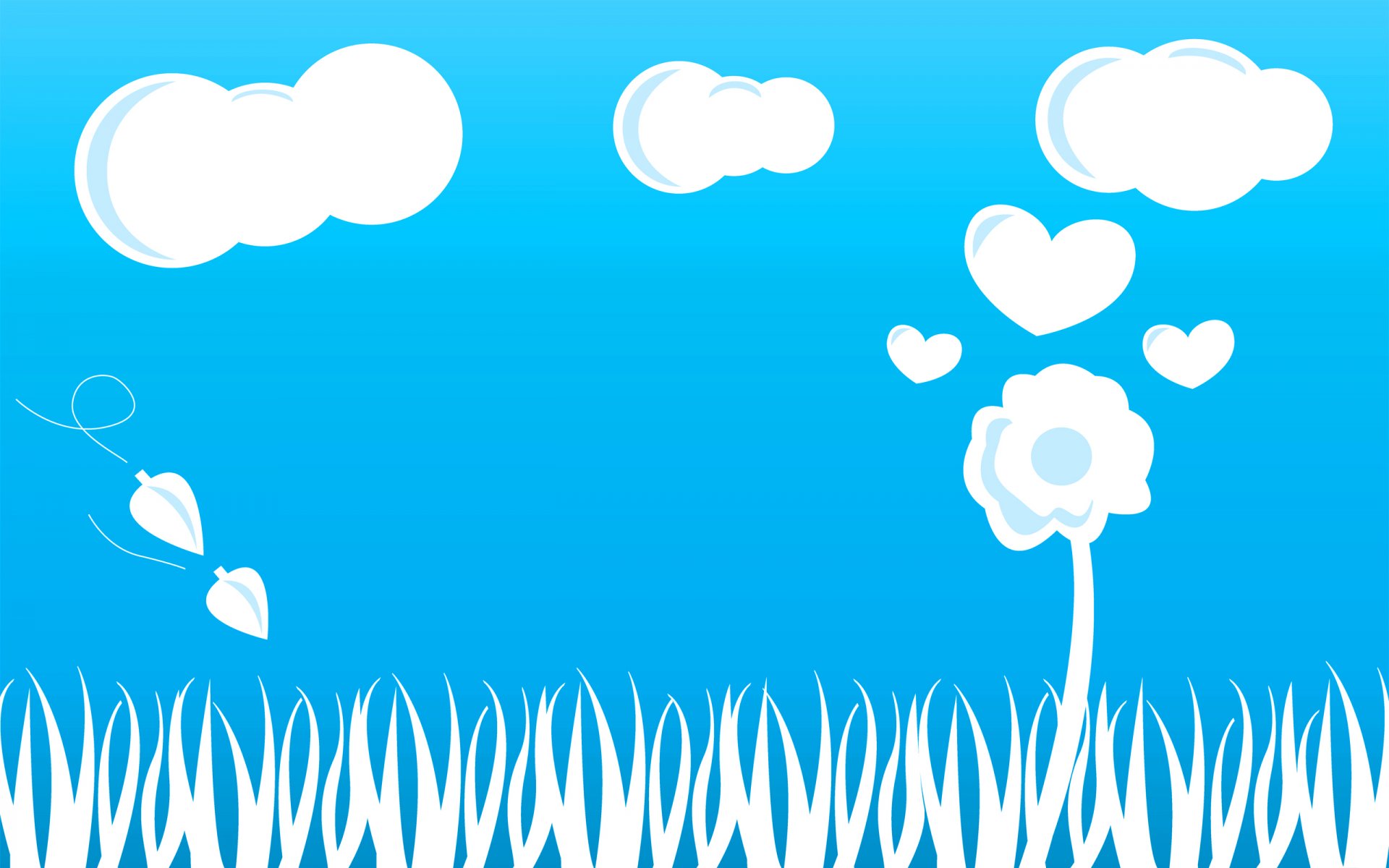 Blau-weiße Landschaft mit Blume, Gras und Wolken