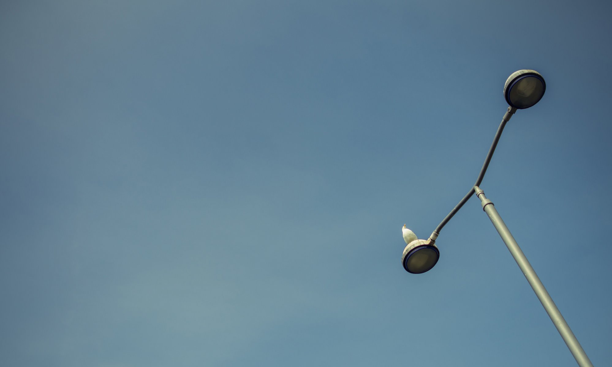 Blau-weiße Landschaft mit Blume, Gras und Wolken