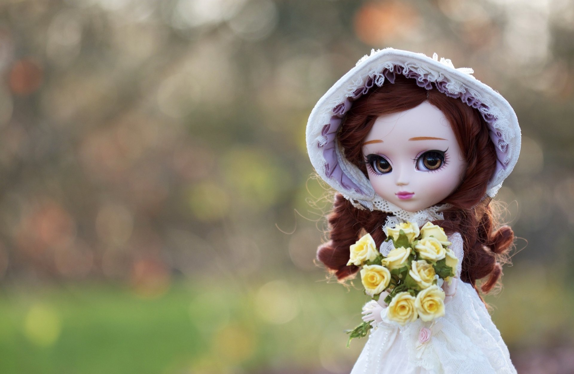 Spielzeugpuppe mit Hut und Blumenstrauß
