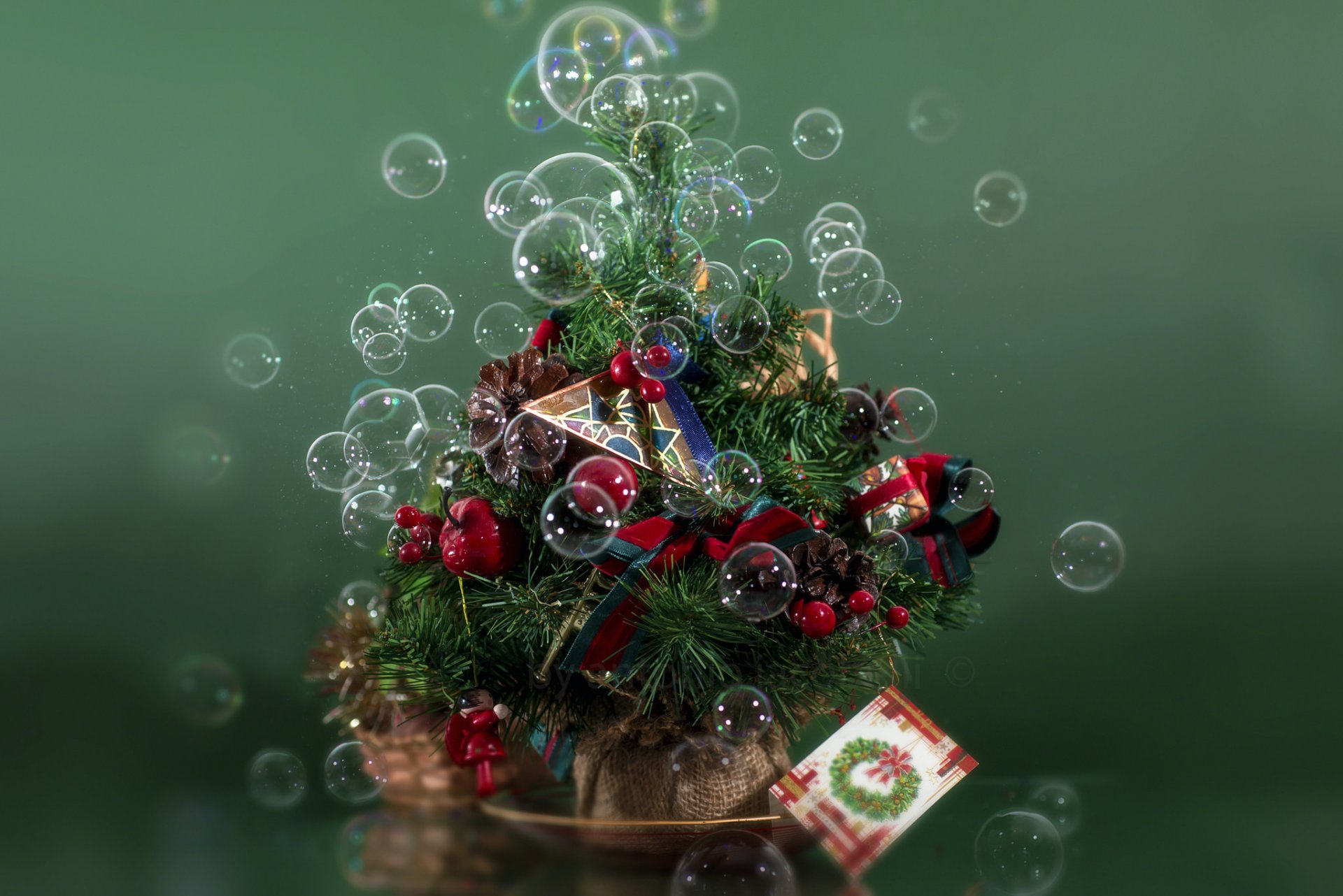 Kleiner weihnachtsbaum mit spielzeug auf grünem hintergrundKleiner Weihnachtsbaum mit Spielzeug auf grünem Hintergrund