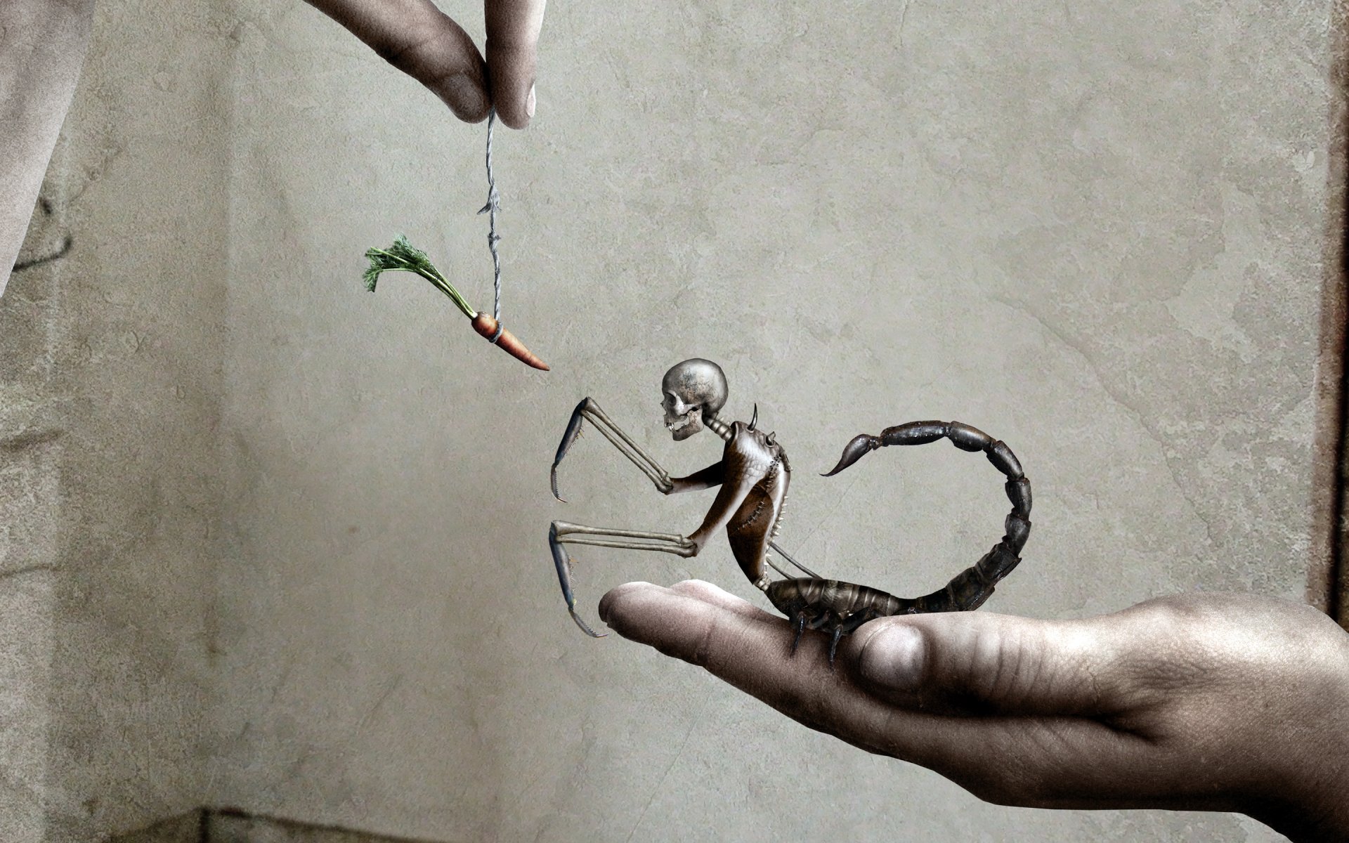 Ein seltsames wesen auf der hand, das karotten liebtEin seltsames Wesen auf der Hand, das Karotten liebt