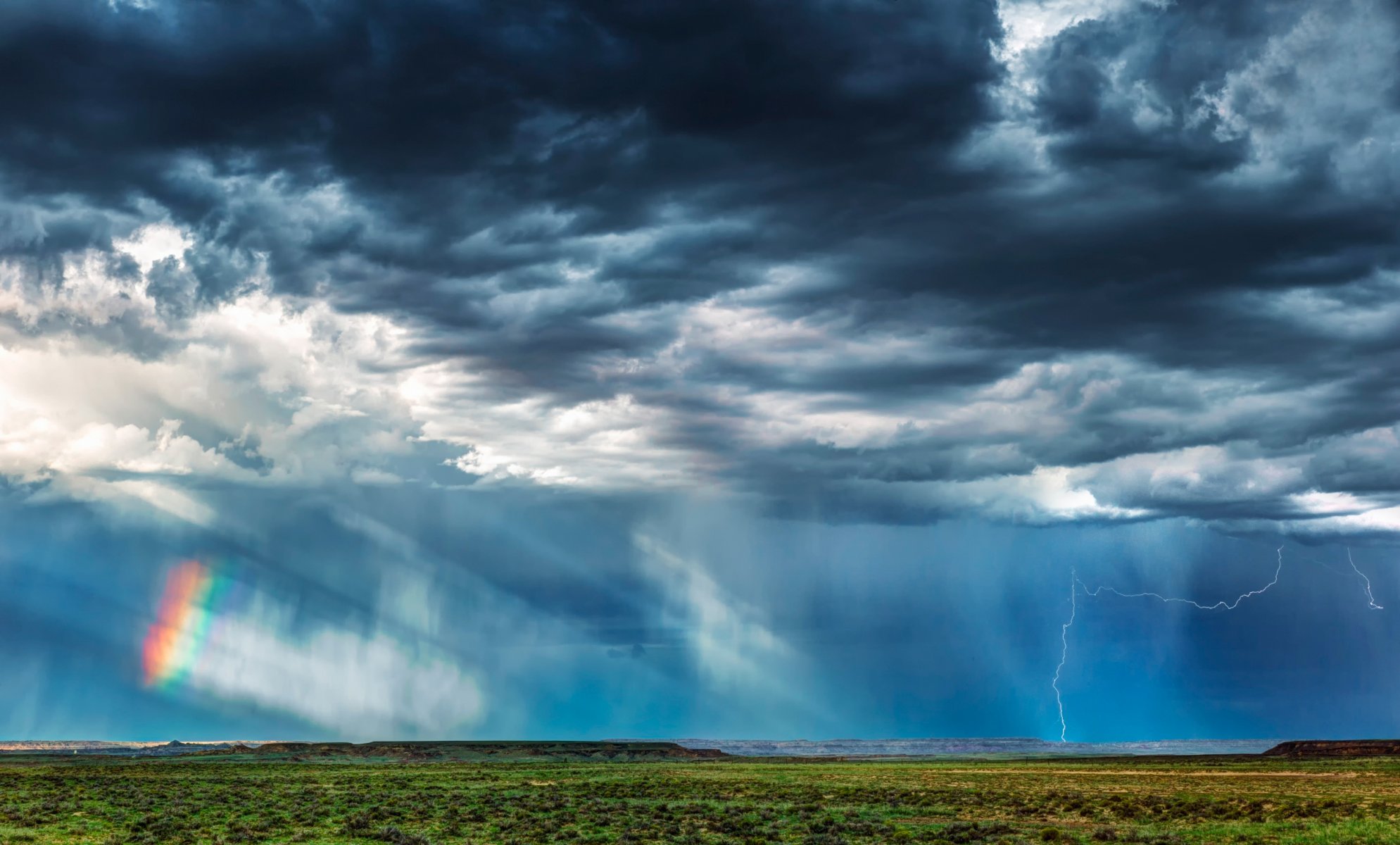 Schwarze, schwere wolken ziehen den himmel über glatten grünen feldern anSchwarze, schwere Wolken ziehen den Himmel über glatten grünen Feldern an
