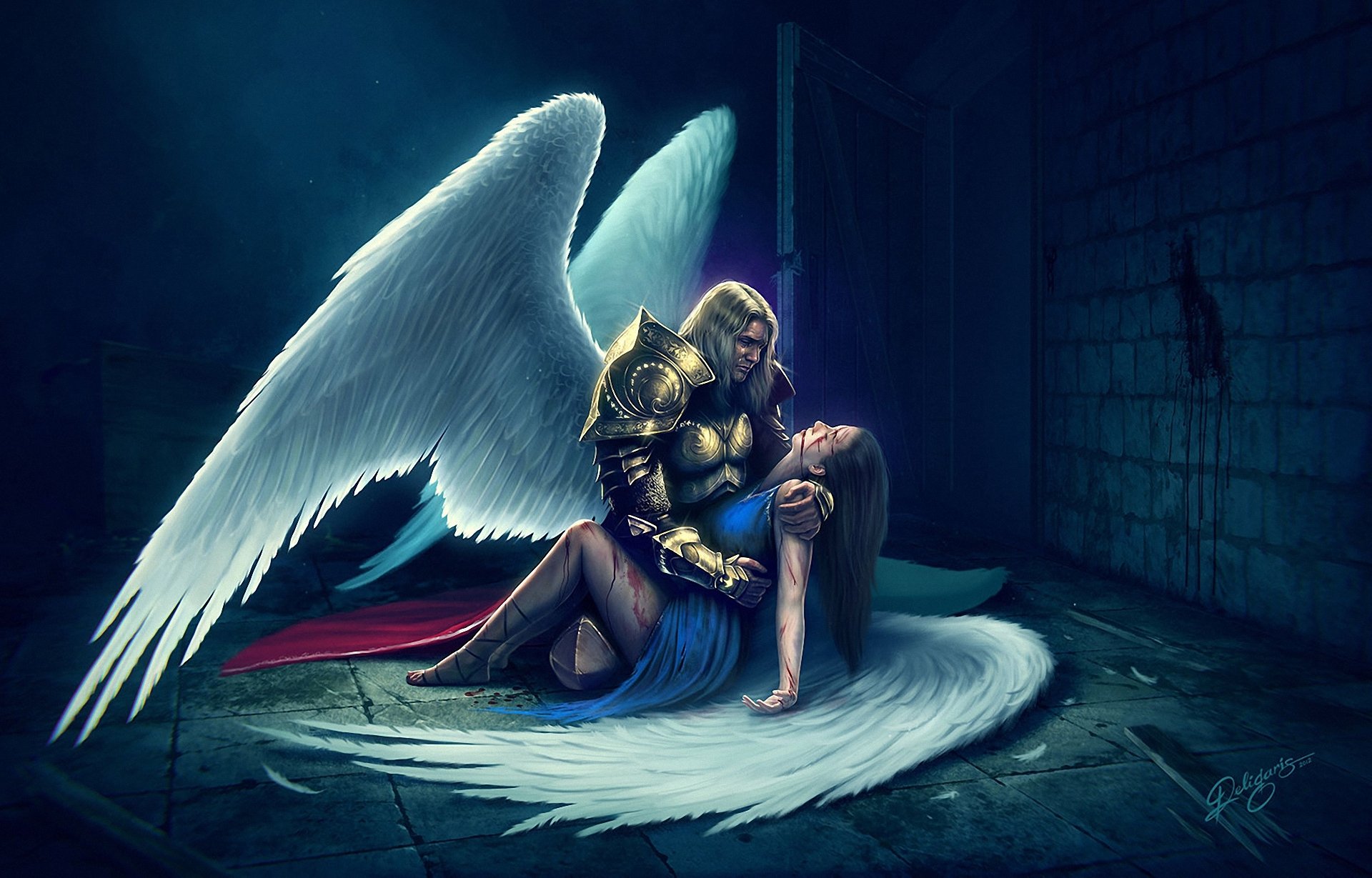 Kunst eines Mannes mit Flügeln, der ein Mädchen mit Flügeln hält