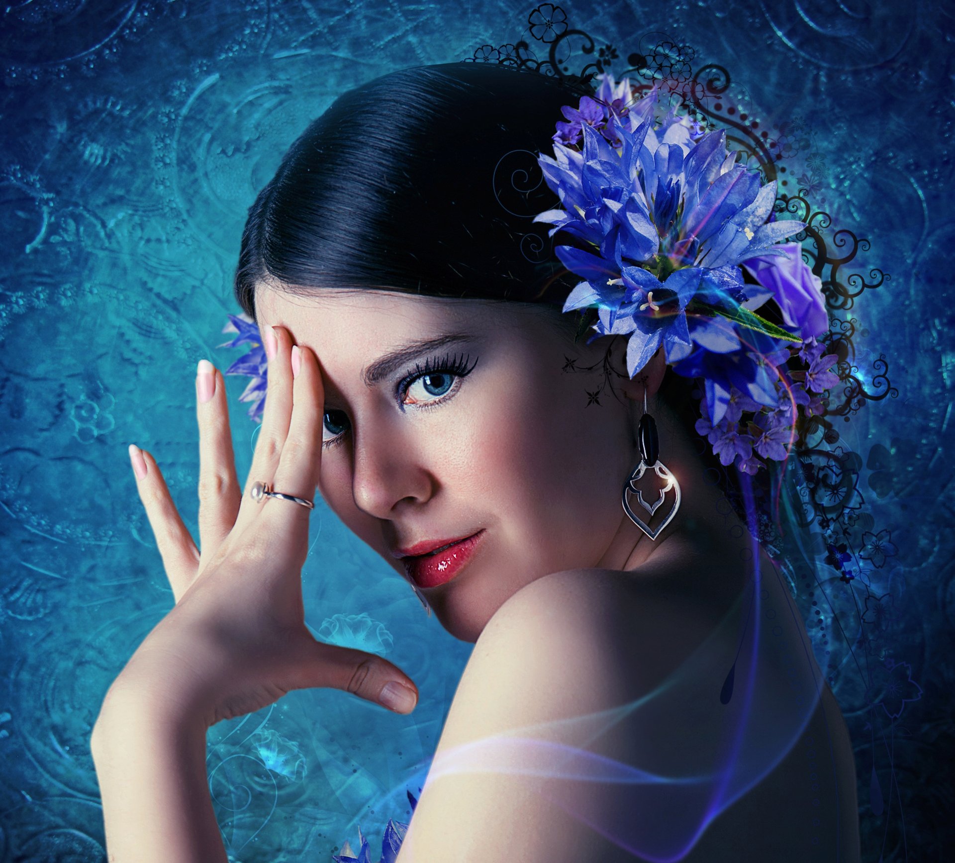 Abbildung eines Mädchens mit blauen Haaren und roter Blume