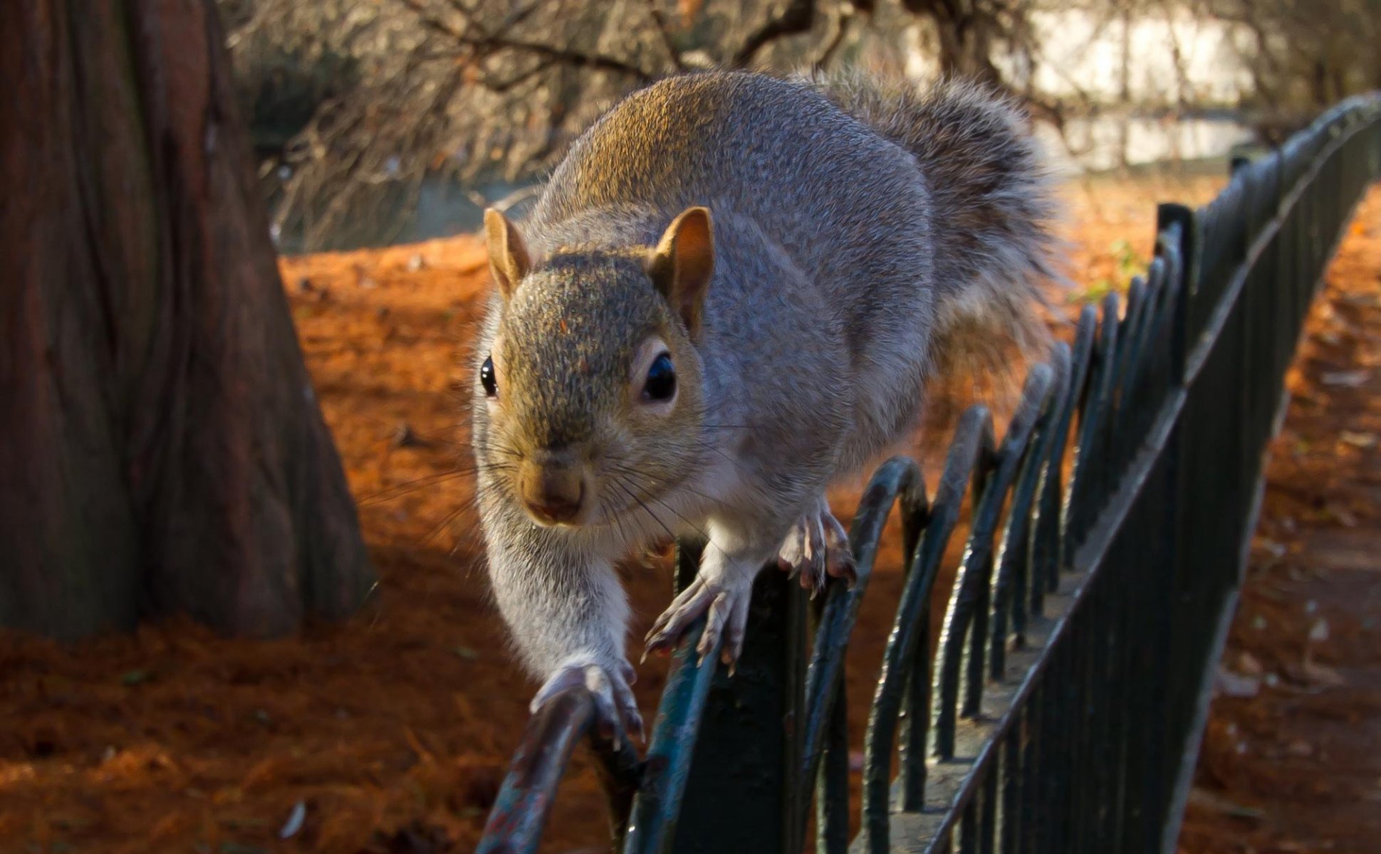 Eichhörnchen kletterte auf den zaun des herbstparksEichhörnchen kletterte auf den Zaun des Herbstparks