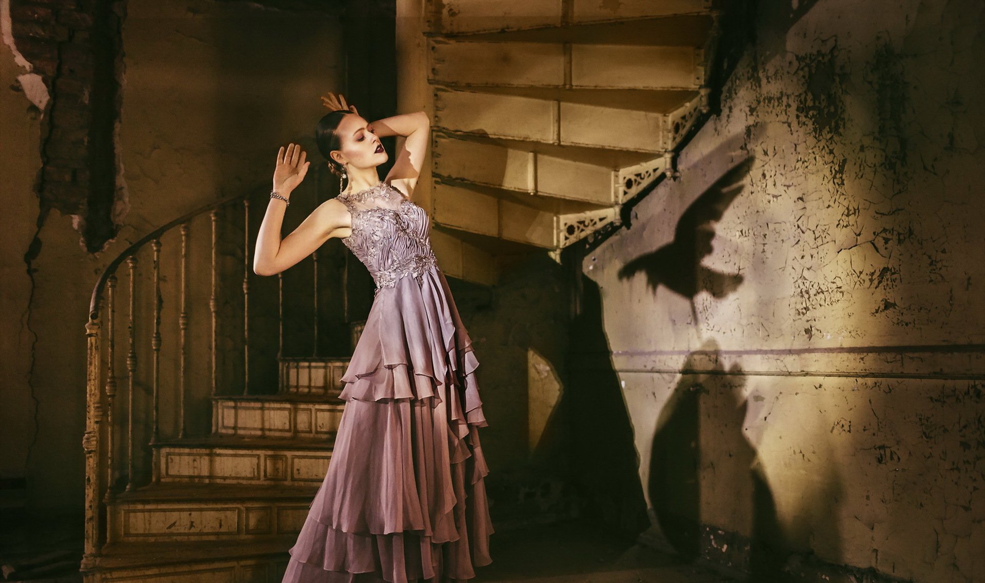 Schatten eines vogels an der wand in der nähe eines mädchensSchatten eines Vogels an der Wand in der Nähe eines Mädchens