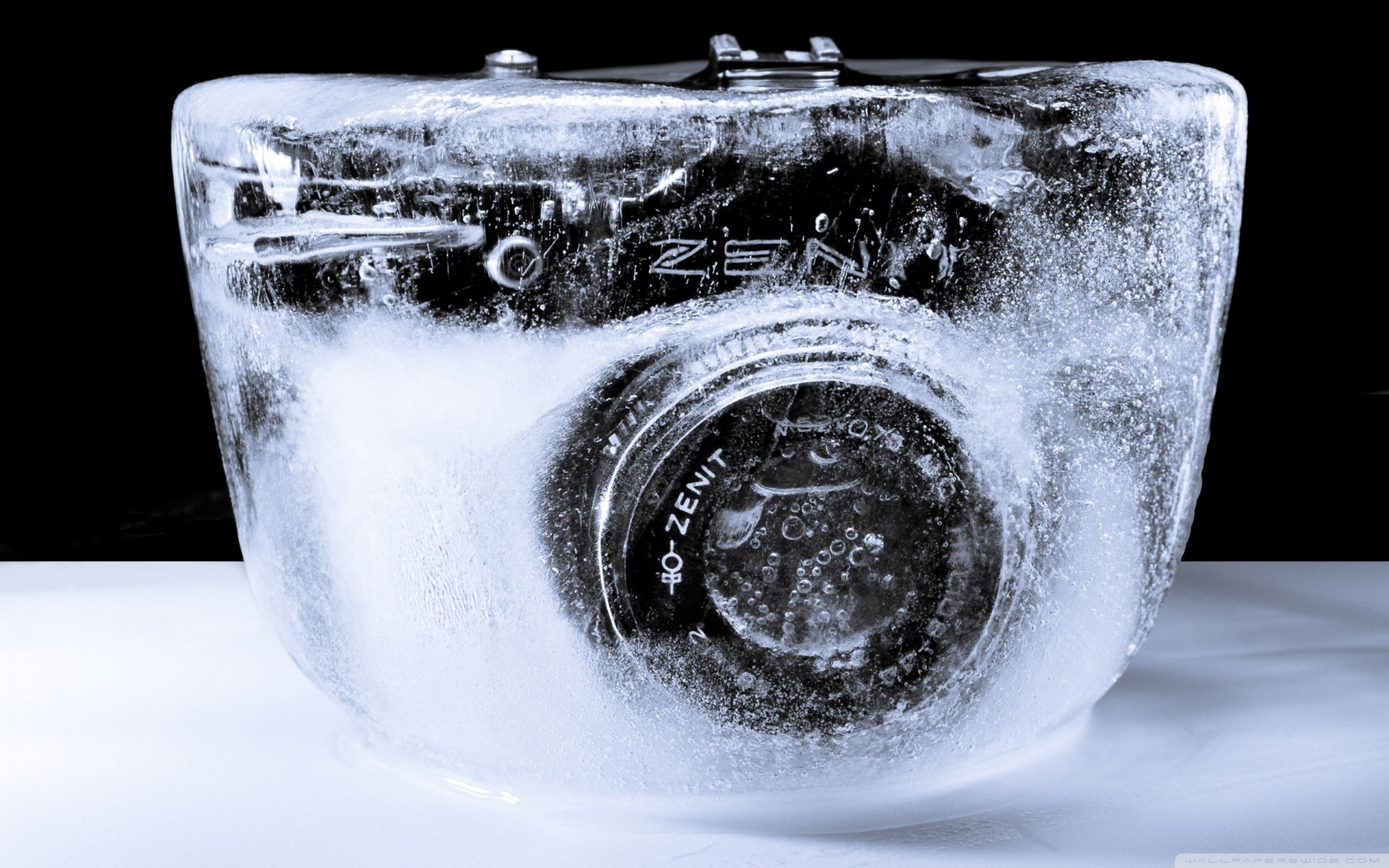 Die Kamera liegt mit einem glänzenden Objektiv auf einem schwarzen Hintergrund