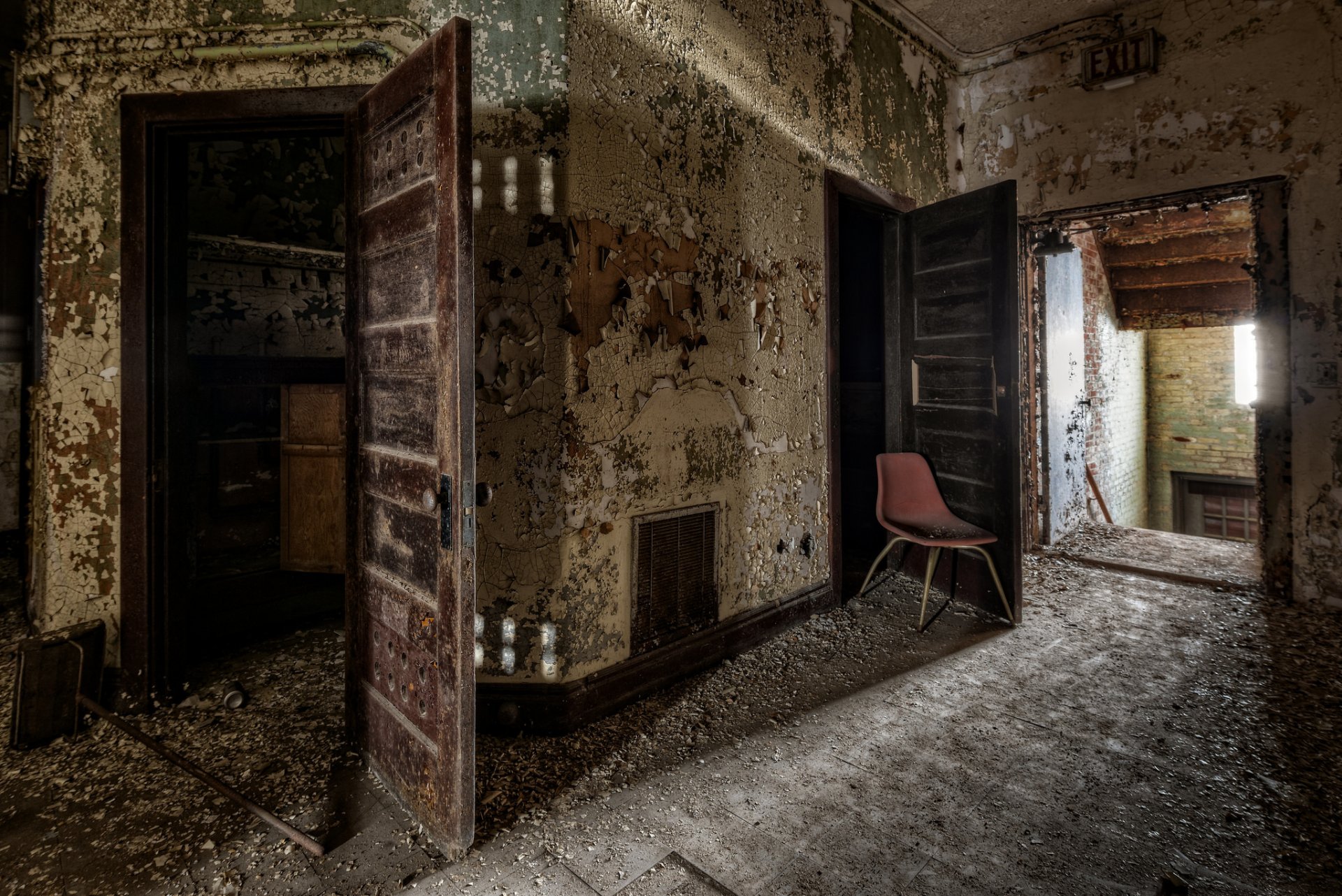 Ein zimmer mit unvollendeten reparaturen und einer seltsamen inschrift an der türEin Zimmer mit unvollendeten Reparaturen und einer seltsamen Inschrift an der Tür
