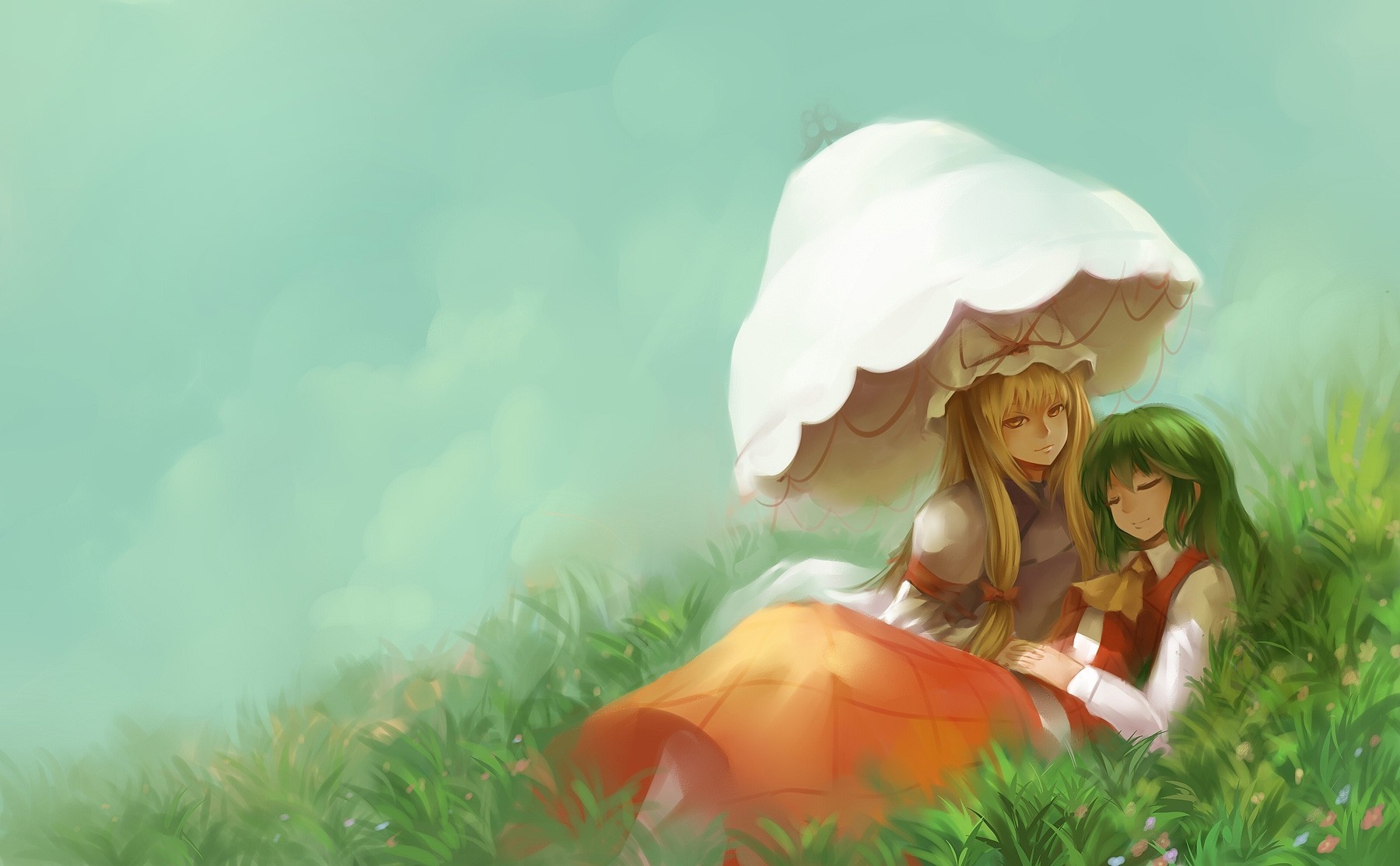 Zwei Mädchen unter einem Regenschirm liegen auf dem Rasen