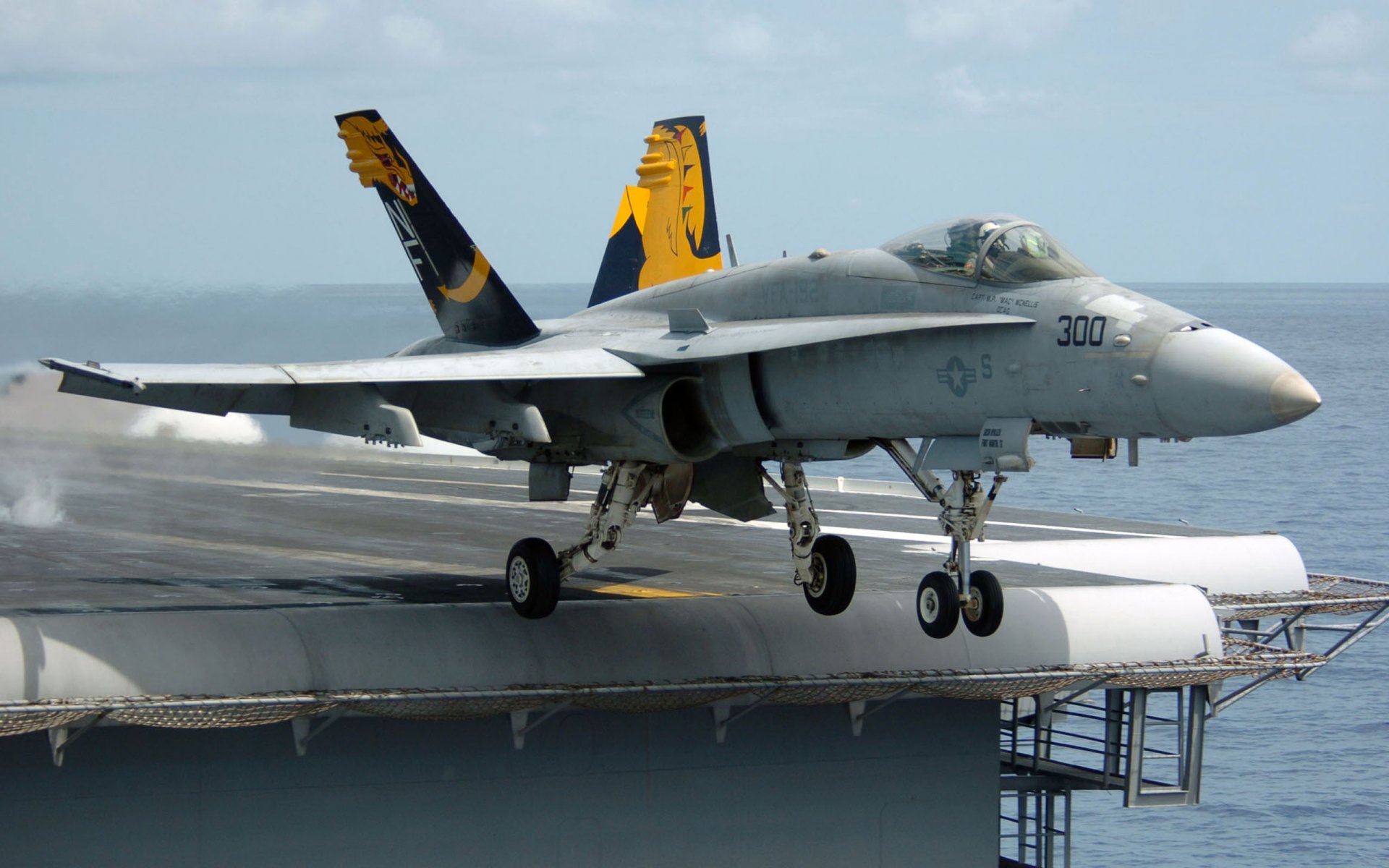 F-18-kampfflugzeug, das vom flugzeugträger abhebt