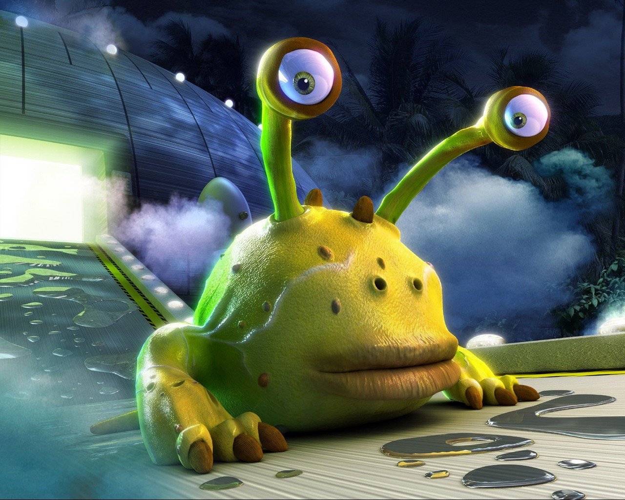 Grüner animierter frosch mit roten augen sitzt auf 3d-seerosenGrüner animierter Frosch mit roten Augen sitzt auf 3D-Seerosen