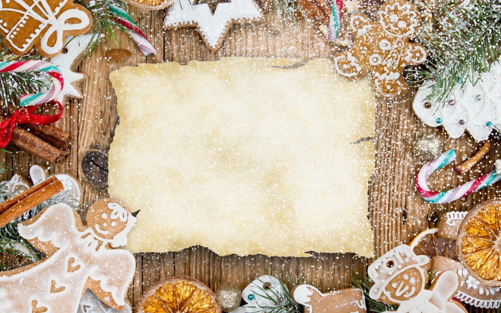Weihnachtsspielzeug auf einem Holztisch um ein leeres Blatt für Glückwünsche