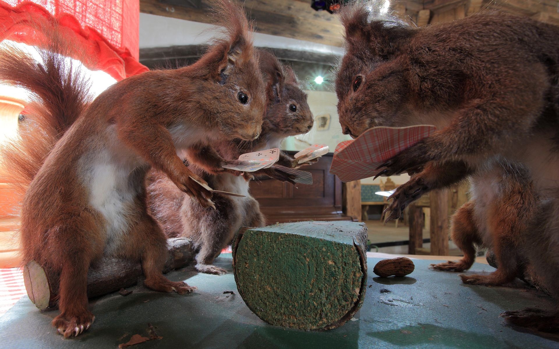 Eichhörnchen spielen Karten auf einem Baumstamm