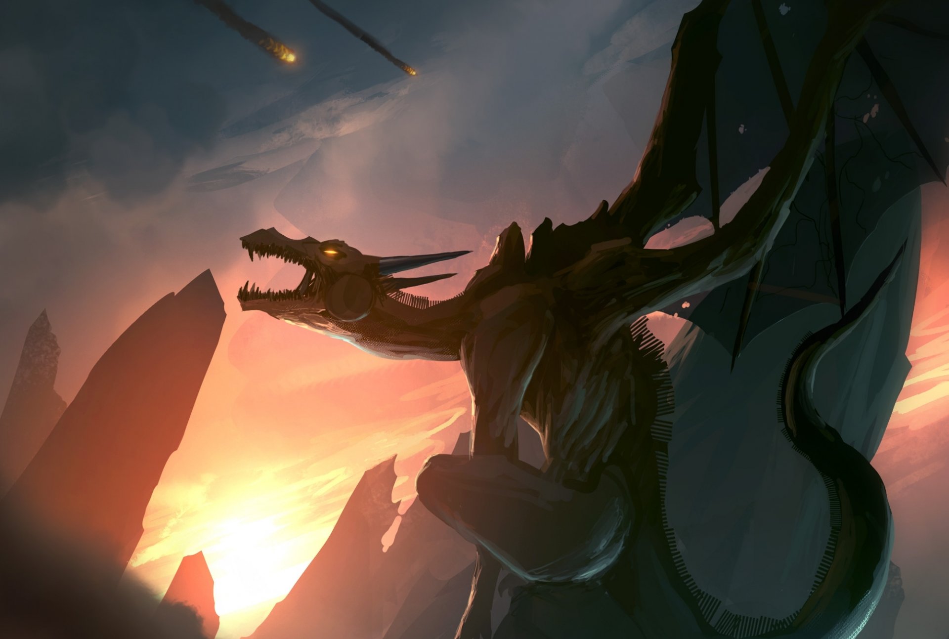 Ein schreiender drache und ein himmel in meteoritenEin schreiender Drache und ein Himmel in Meteoriten