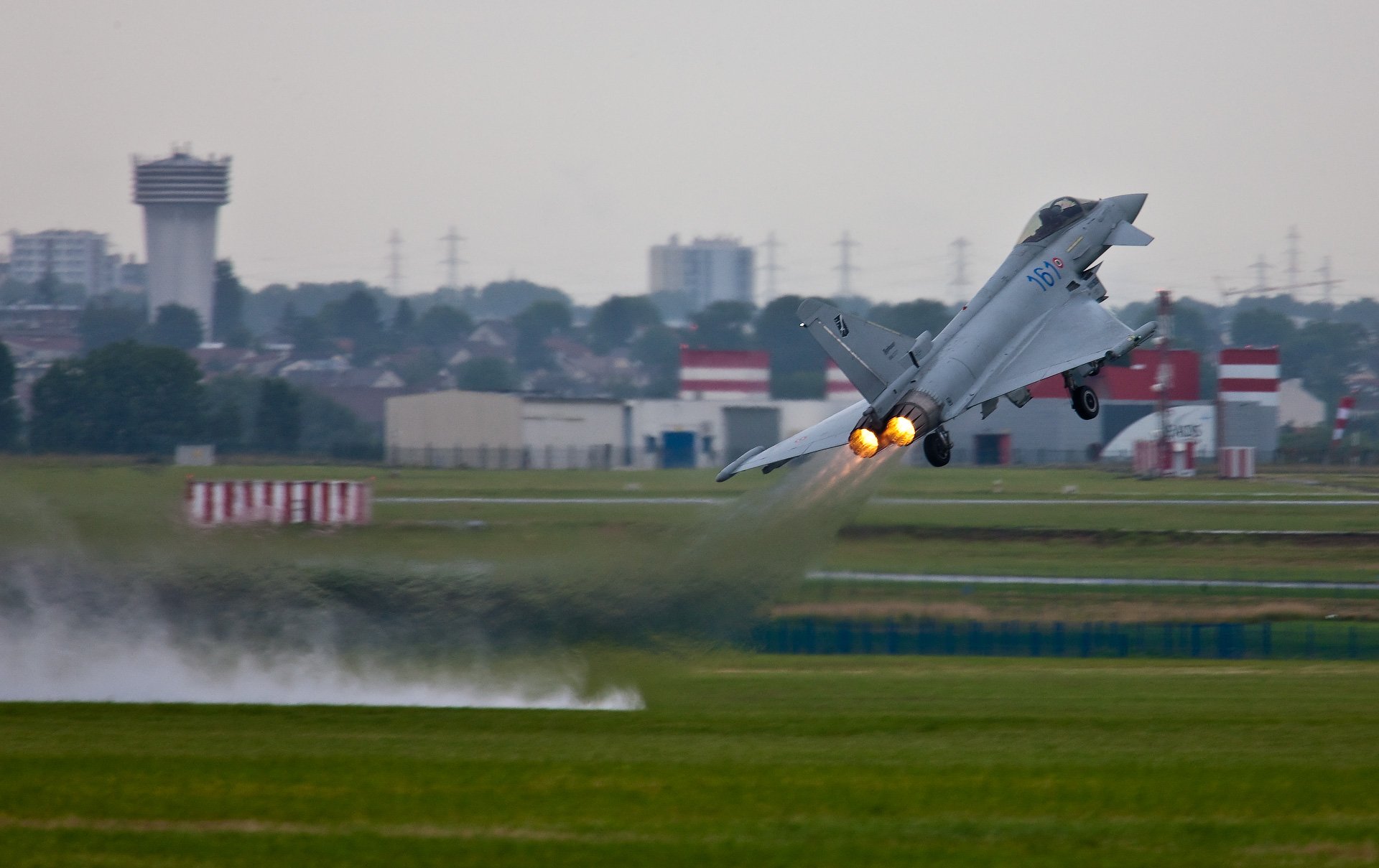 Kampfflugzeug hebt vom Flughafen ab und hinterlässt Spuren