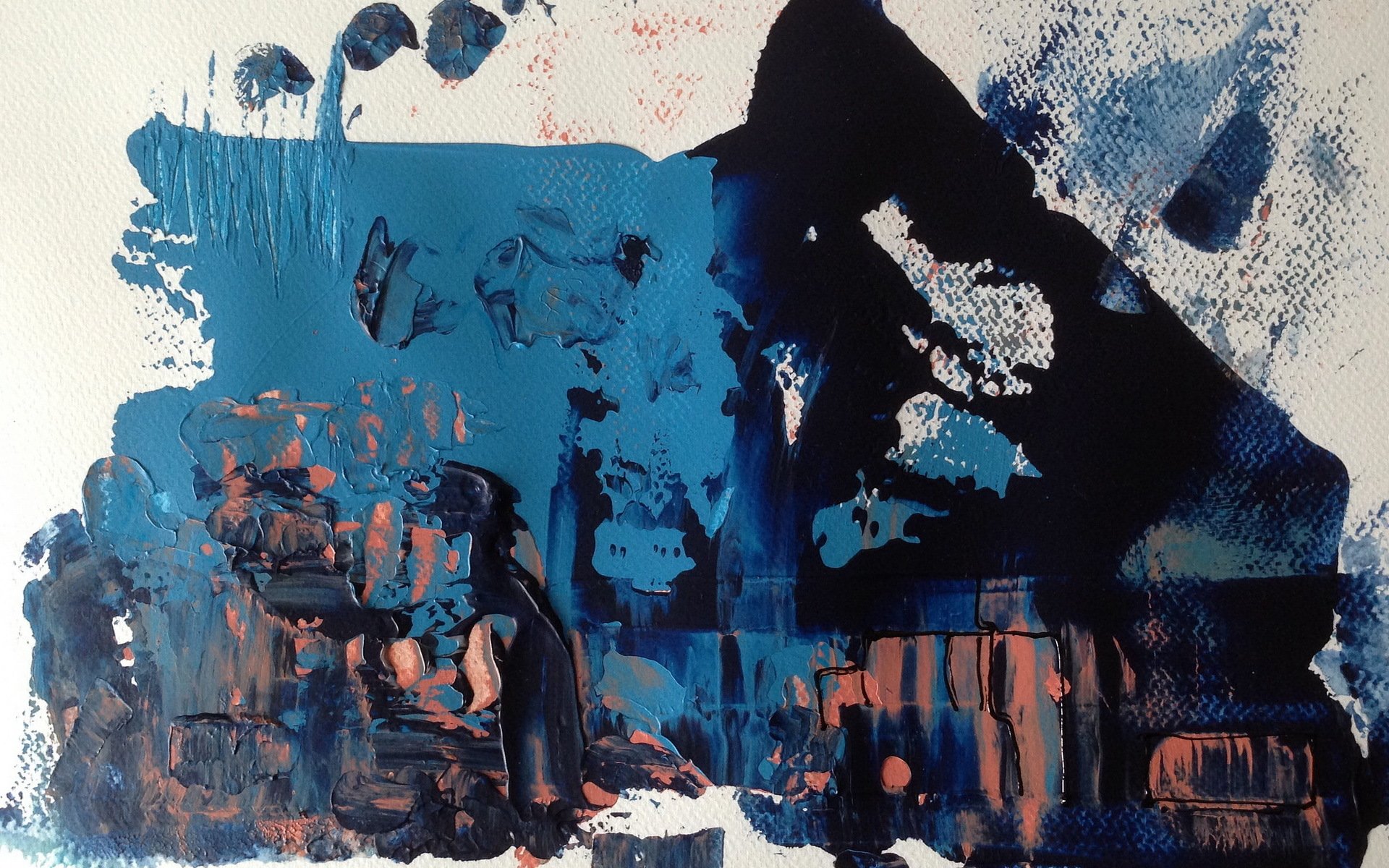 Abstraktes Bild mit rotem Zaun und schwarzen und blauen Kreisen
