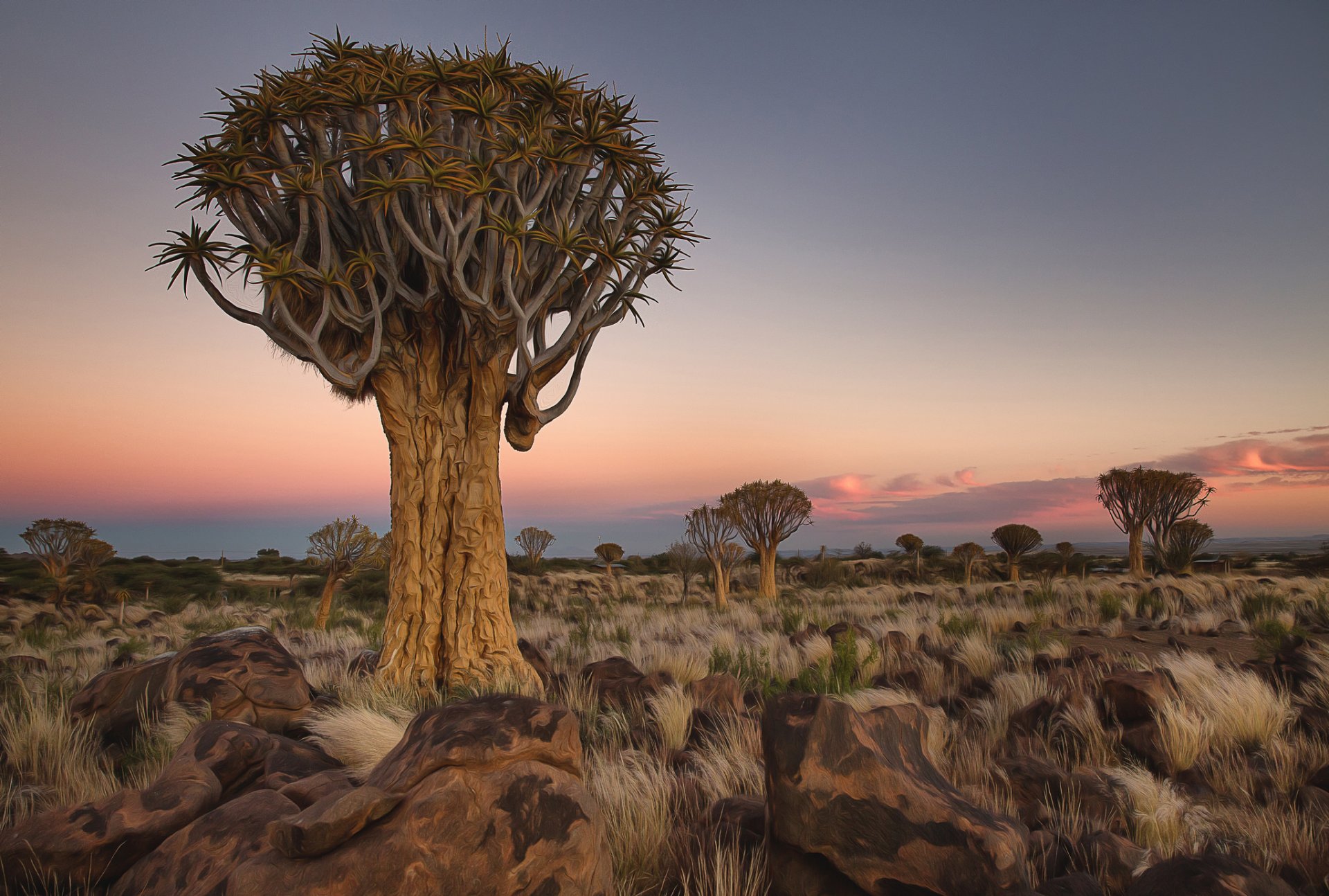 Afrikanische landschaft mit bäumen und steinen