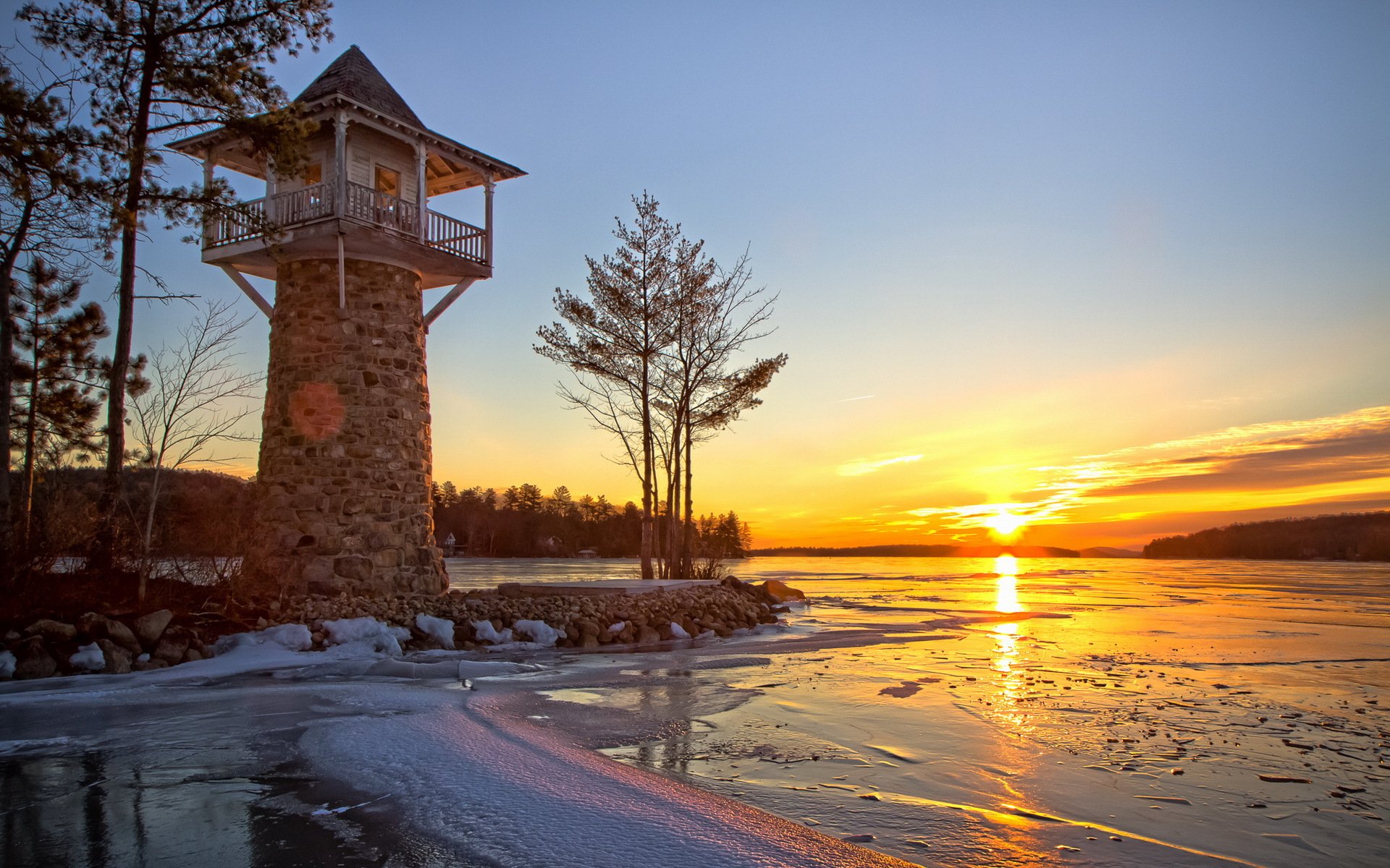 Herbstlandschaft am See mit Sonnenuntergang am Himmel