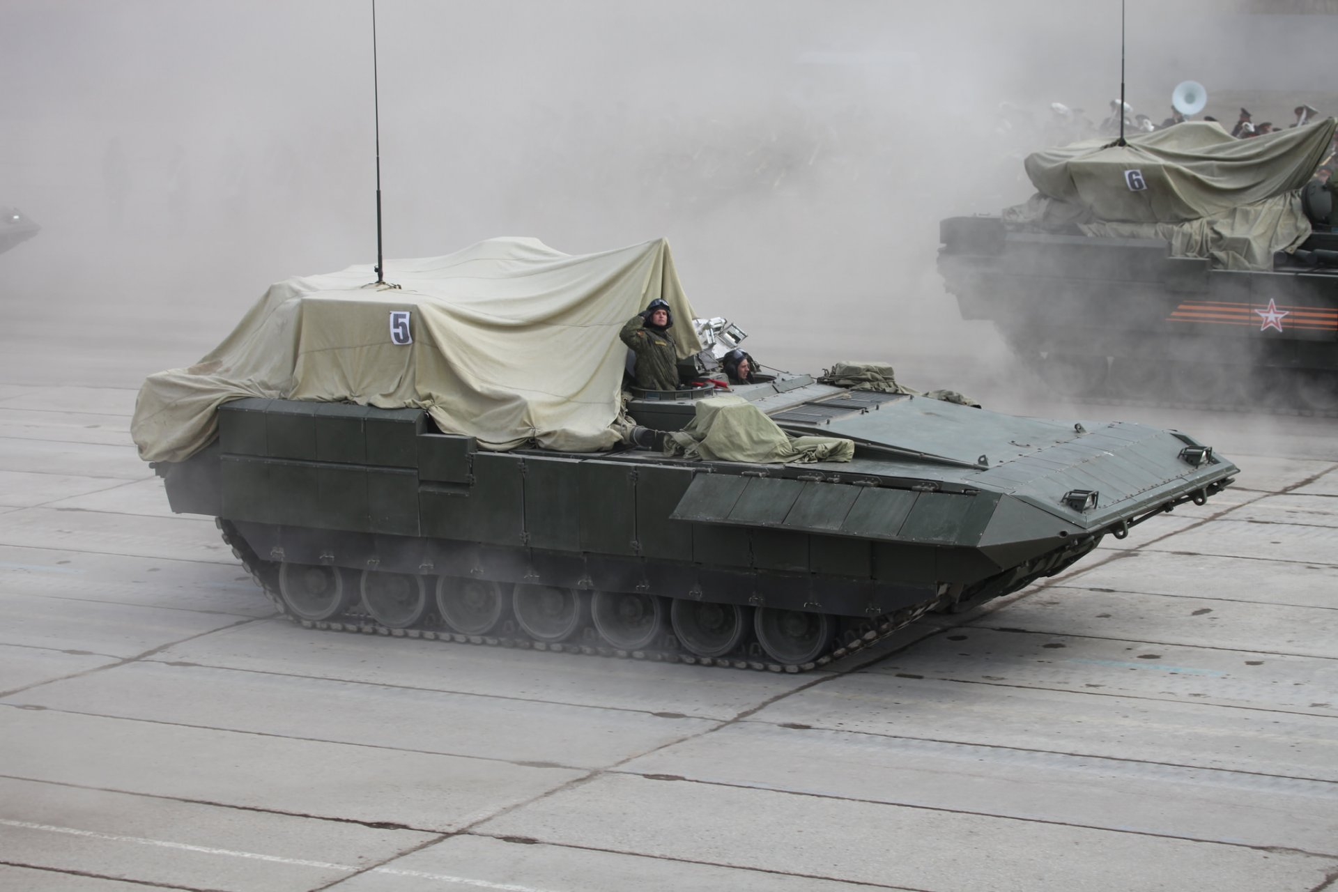 Ein fahrender Panzer unter einem Schleier mit einem Soldaten