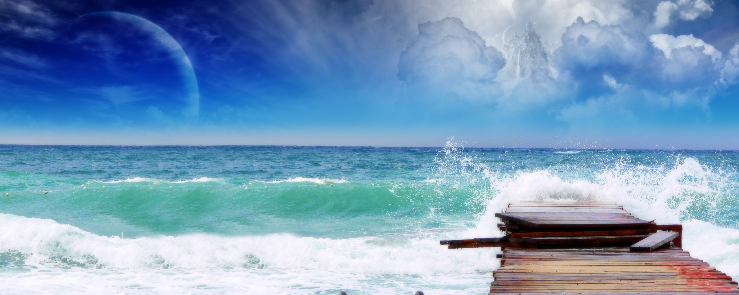 Grüne Meereswellen brechen an einem Steg unter blauem Himmel auf, in dem eine Luftburg aus Wolken sichtbar ist