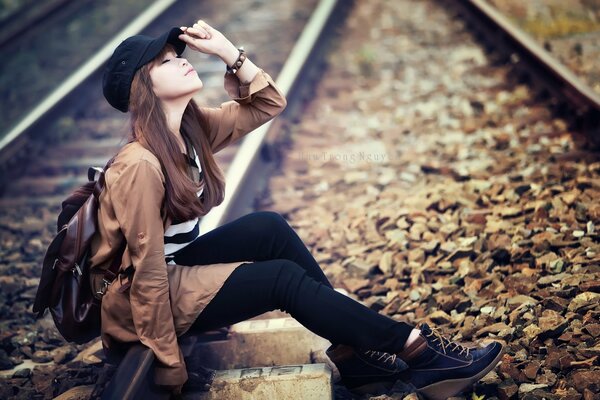 Asiatische mädchen in einer kappe sitzt auf den gleisenAsiatische Mädchen in einer Kappe sitzt auf den Gleisen