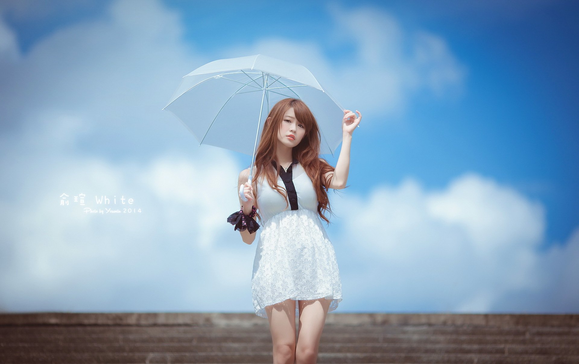 Asiatisches mädchen im hochzeitskleid unter dem sommerschirmAsiatisches Mädchen im Hochzeitskleid unter dem Sommerschirm