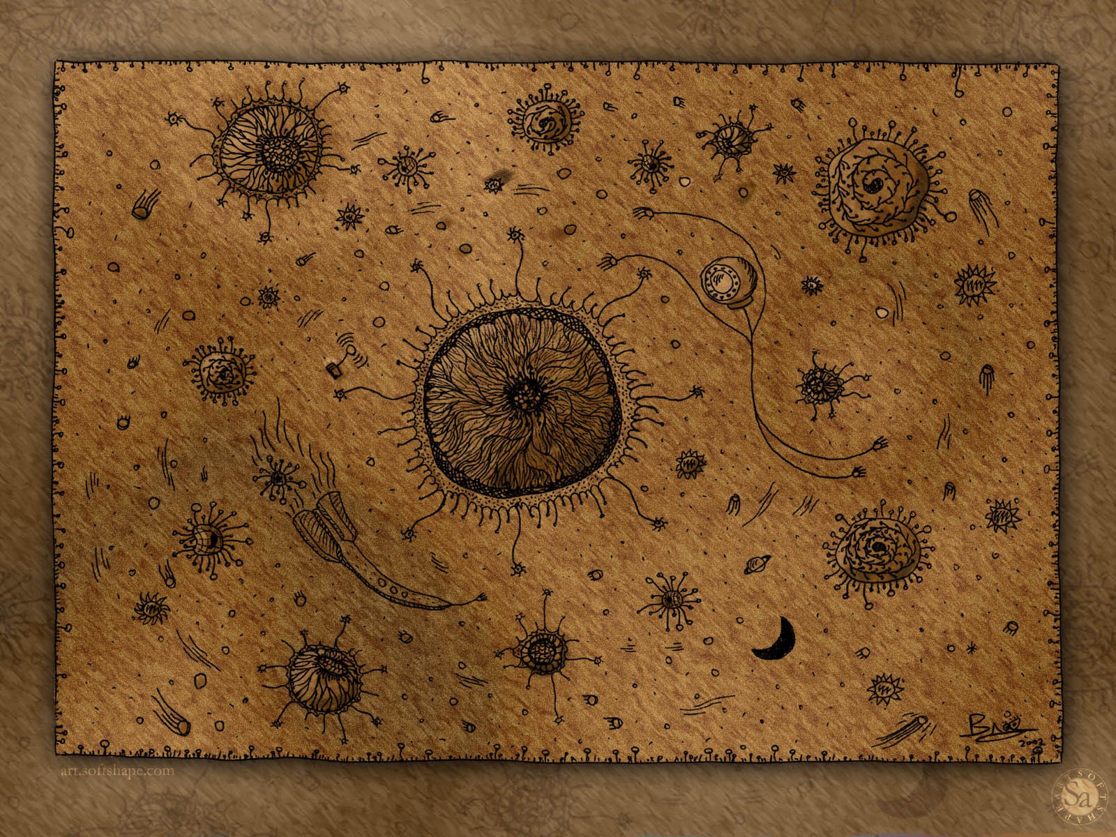 Primitive Darstellung von Planeten und Raketen