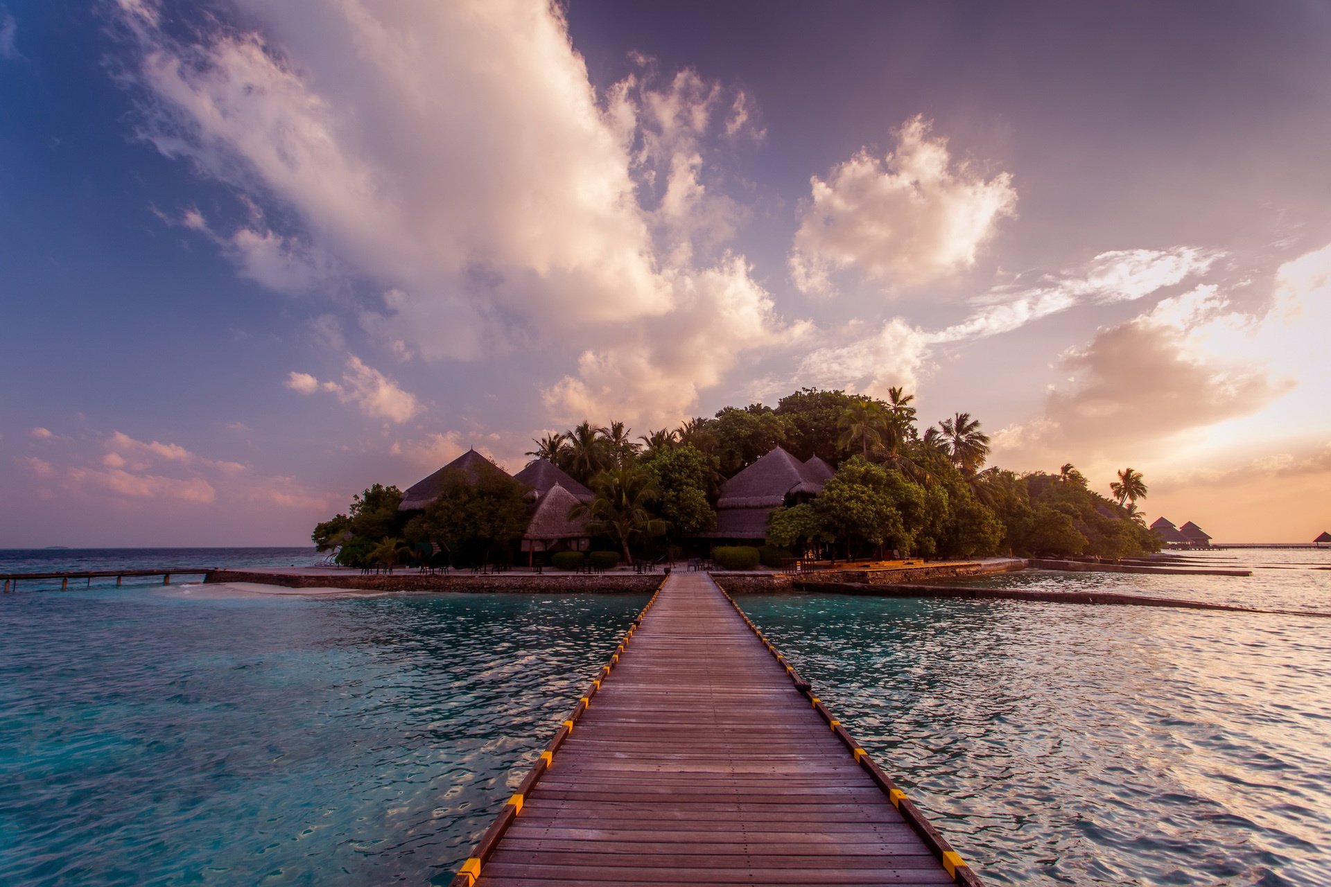 Palmen, Strand, Berge, Wolken im Resort im Ozean