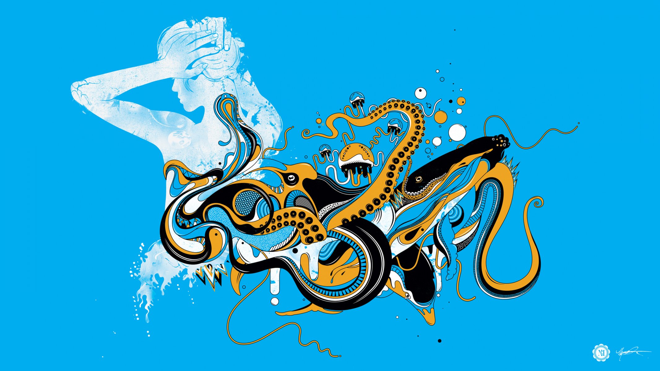 Auf blauem hintergrund ein weißes mädchen und ein gelber oktopusAuf blauem Hintergrund ein weißes Mädchen und ein gelber Oktopus