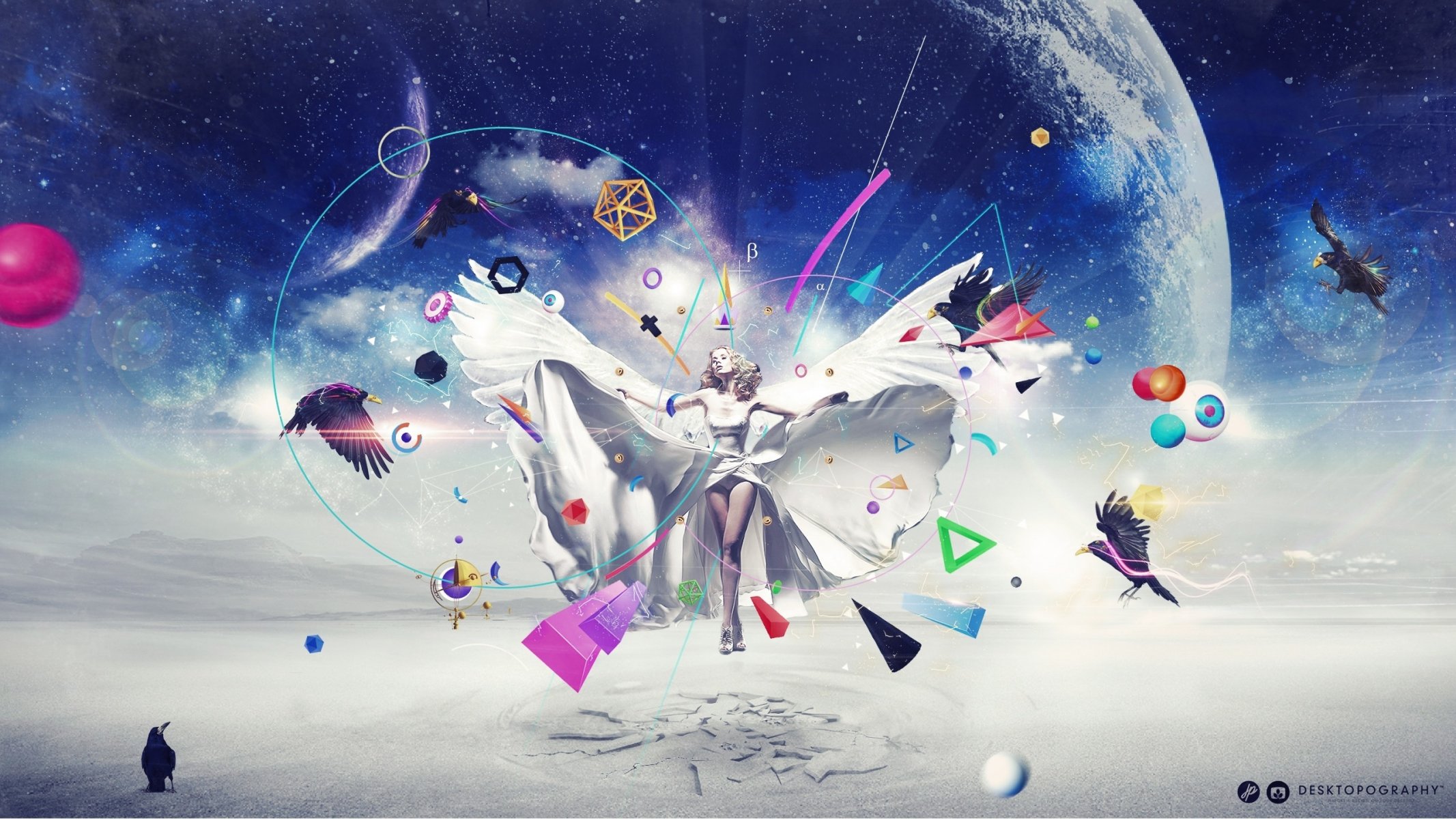 Mädchen umgeben von einem vogel auf einem planeten hintergrundMädchen umgeben von einem Vogel auf einem Planeten Hintergrund