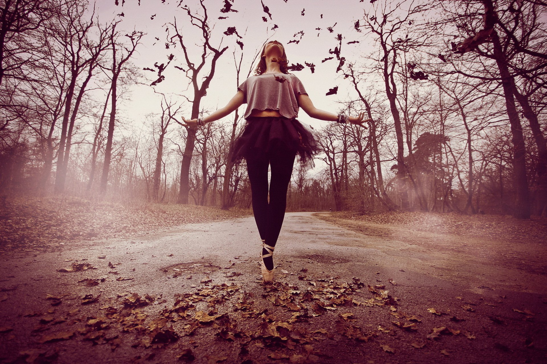Mädchen tanzt auf der Straße, umgeben von Blättern