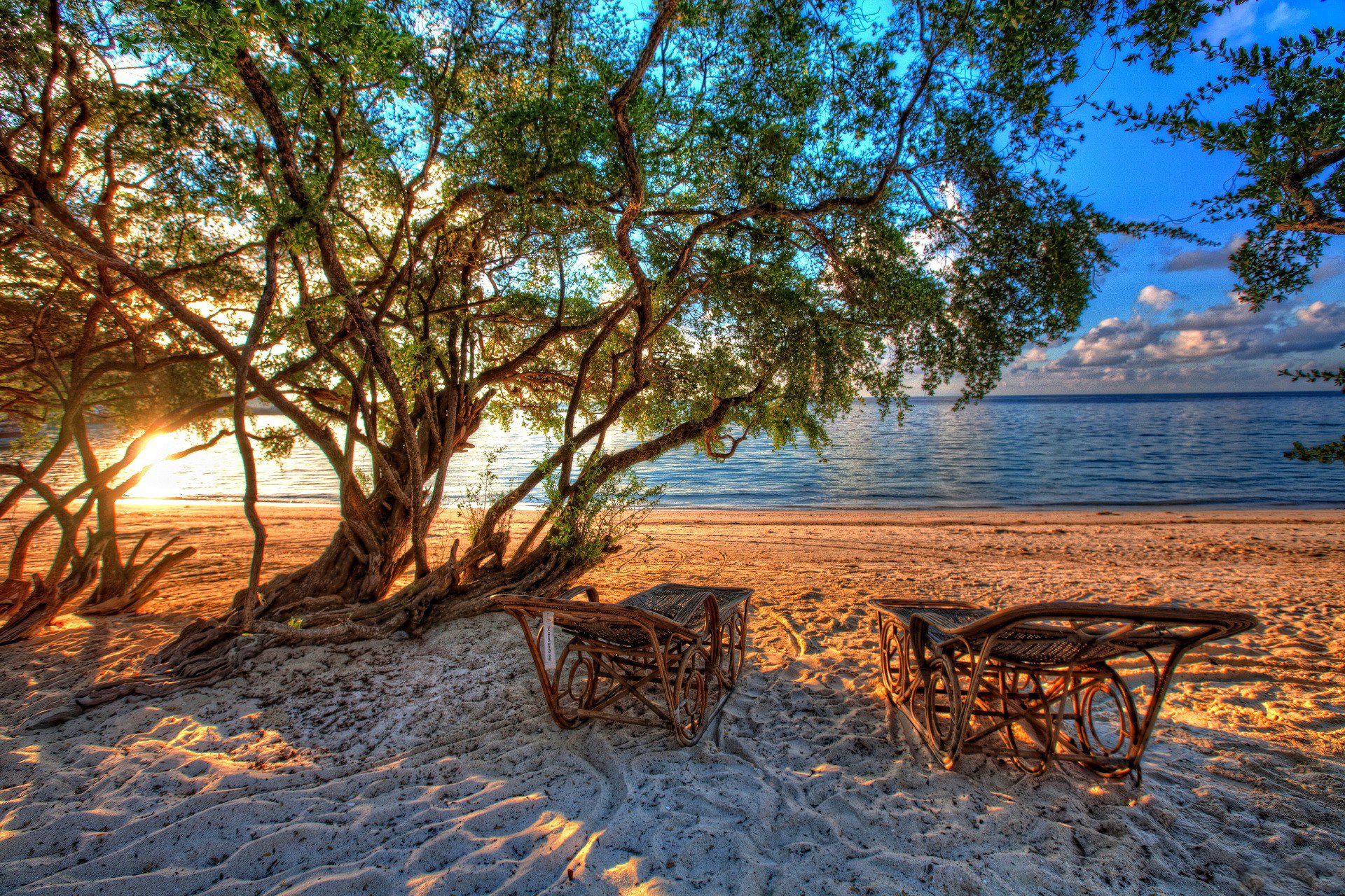 Ein paar geschnitzte liegestühle stehen auf einem ausgetretenen sandstrand in der nähe eines geflochtenen baumes und eines flusses, hinter dem die sonne untergehtEin Paar geschnitzte Liegestühle stehen auf einem ausgetretenen Sandstrand in der Nähe eines geflochtenen Baumes und eines Flusses, hinter dem die Sonne untergeht