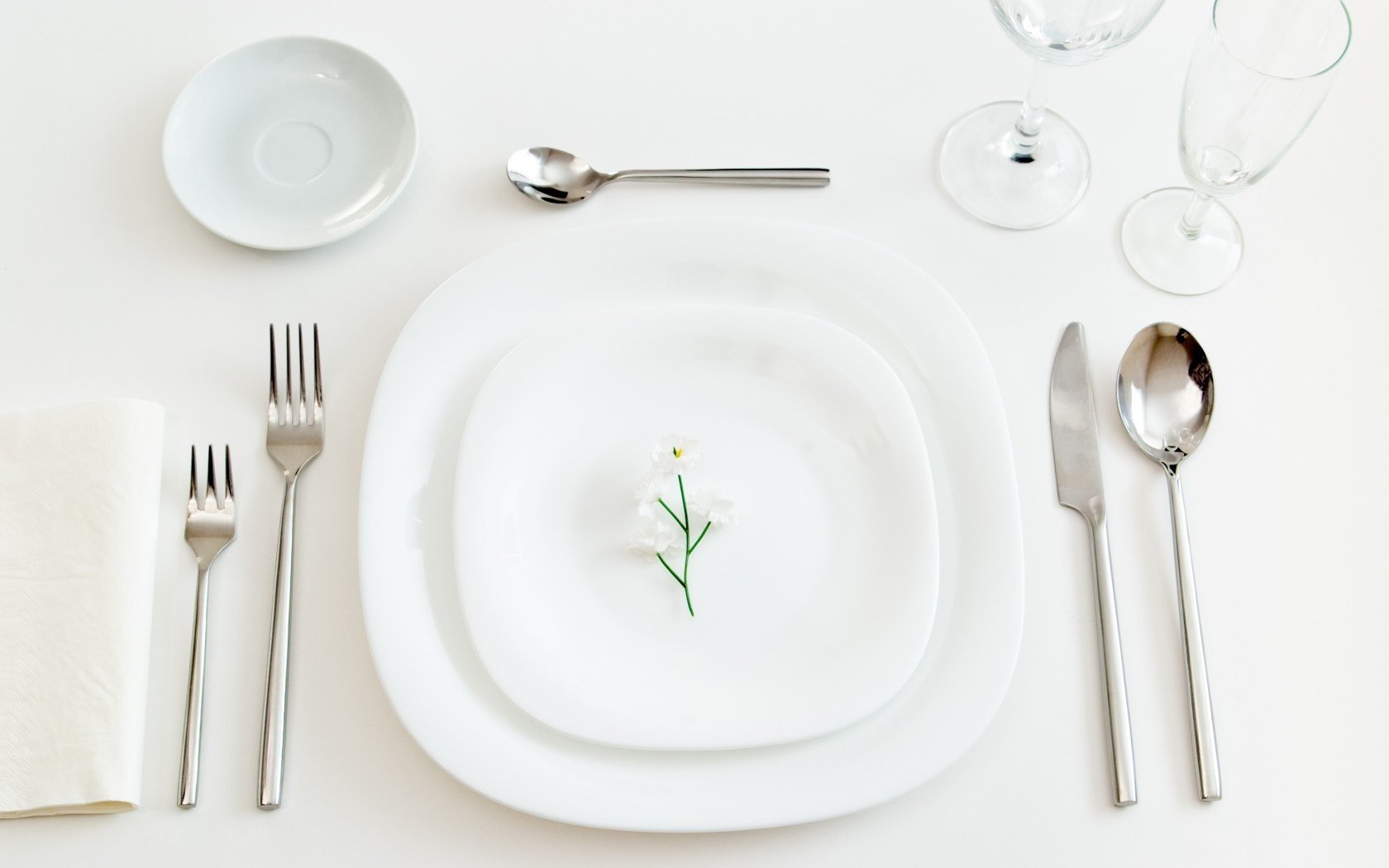 Blume auf einem weißen teller auf einem weißen tisch mit gerätenBlume auf einem weißen Teller auf einem weißen Tisch mit Geräten