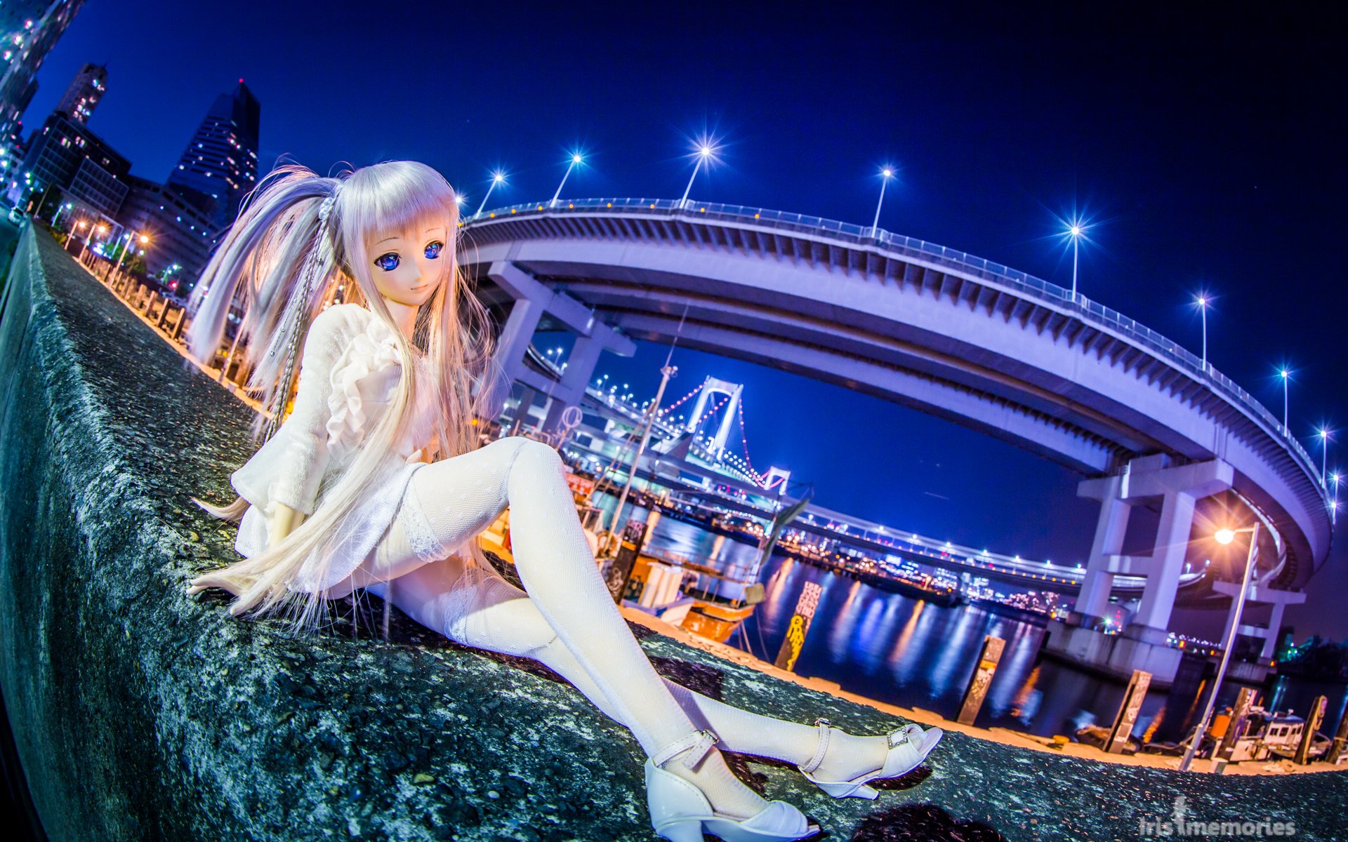 Spielzeugpuppe auf der uferbrücke in der nachtstadtSpielzeugpuppe auf der Uferbrücke in der Nachtstadt