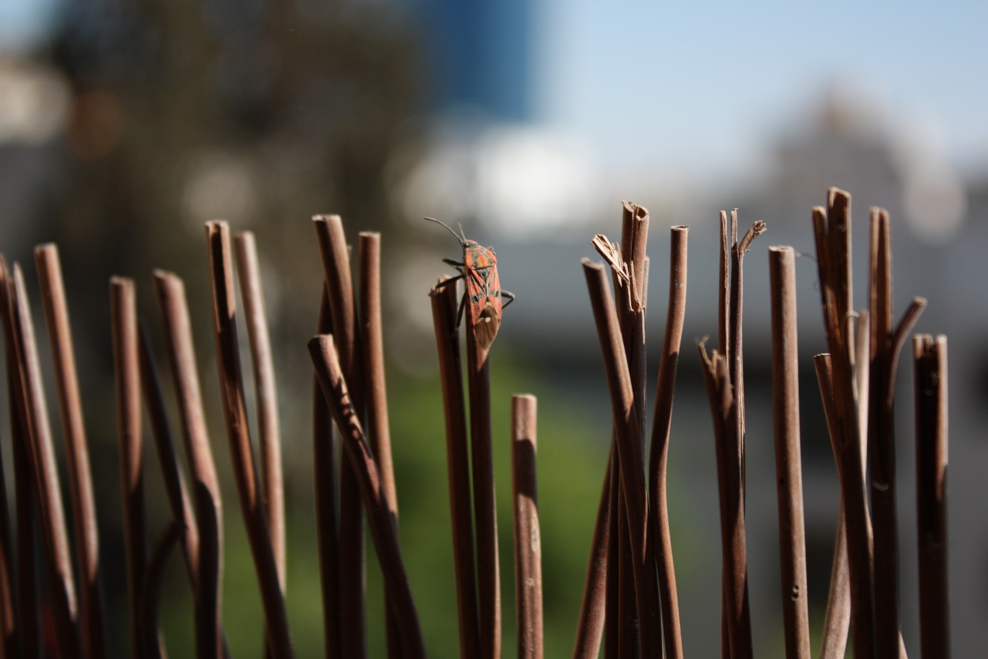 Das Insekt verkleidete sich auf Zweigen mit einem unscharfen Hintergrund