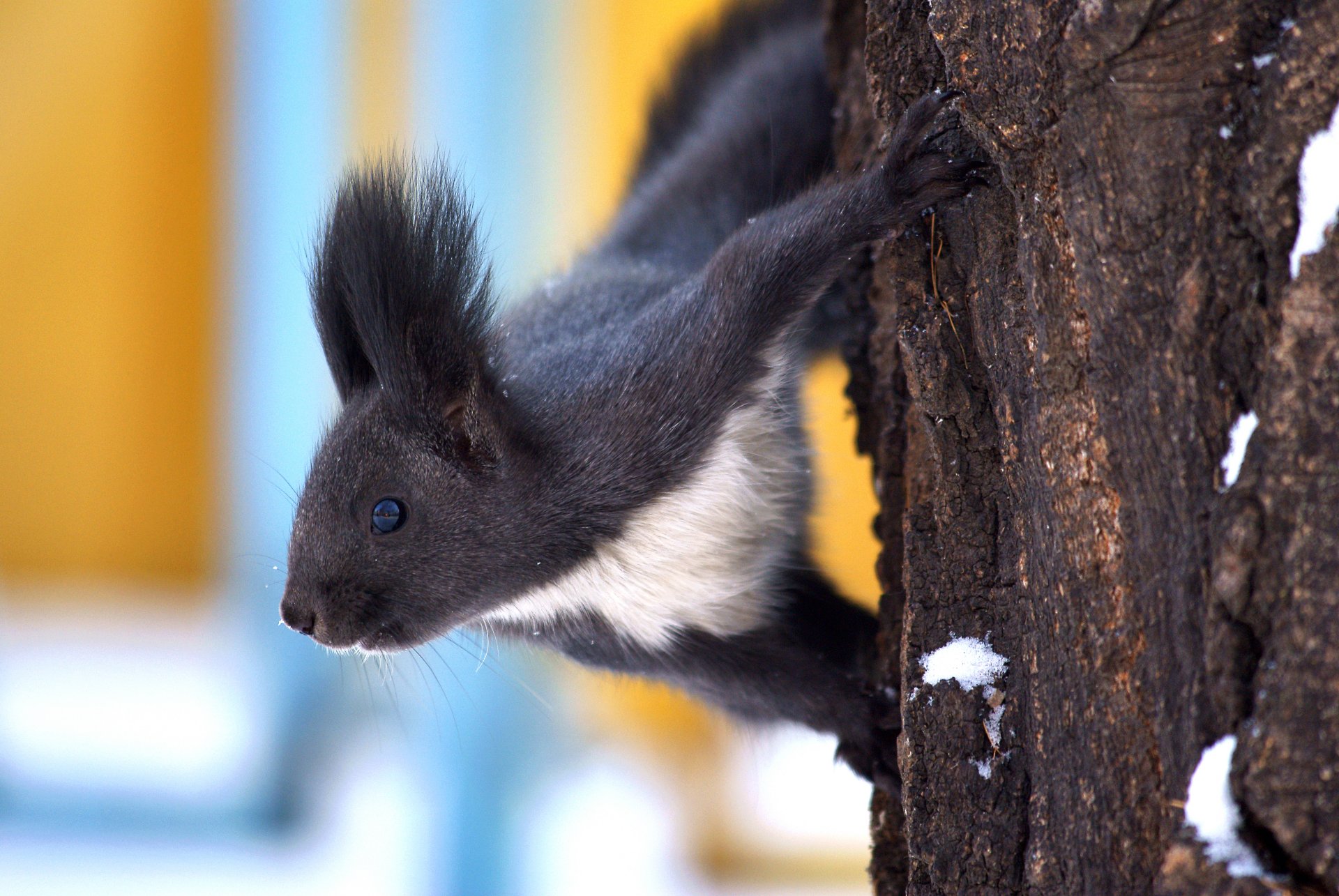 Schwarzes Eichhörnchen mit weißer Brust am Baum