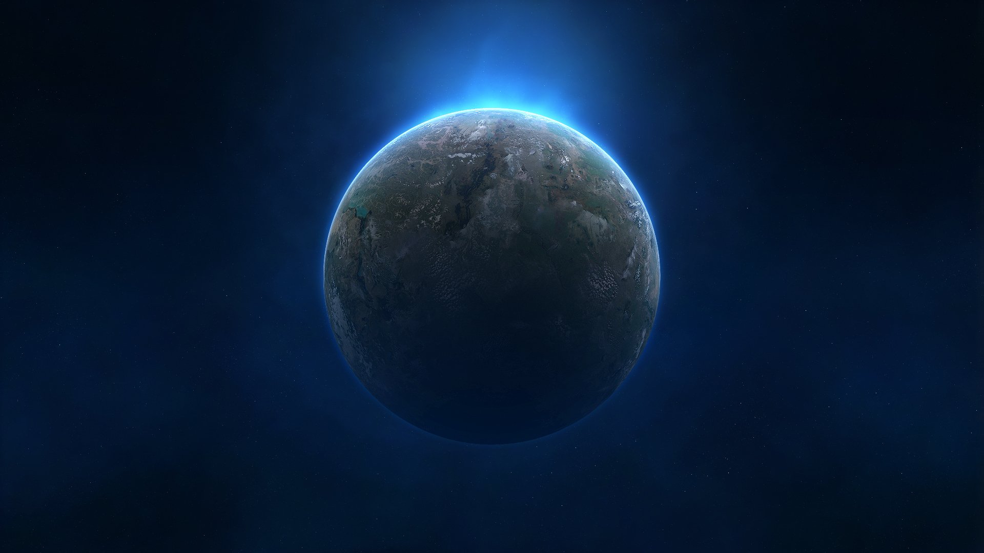 Sonnenaufgang über einem von Nebel umgebenen Planeten
