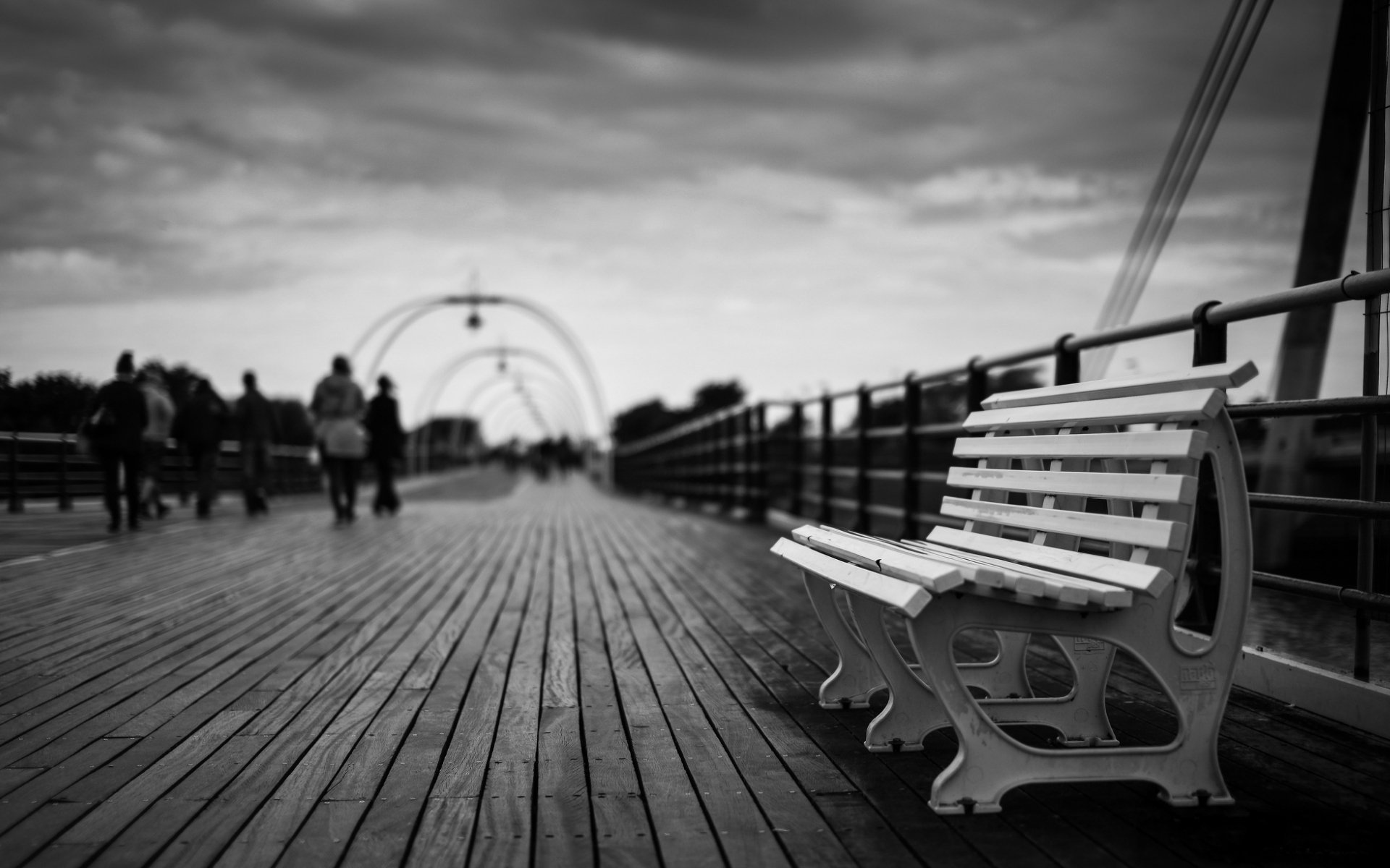 Straße mit einer bank auf dem hintergrund eines teiches mit wolkenkratzernStraße mit einer Bank auf dem Hintergrund eines Teiches mit Wolkenkratzern