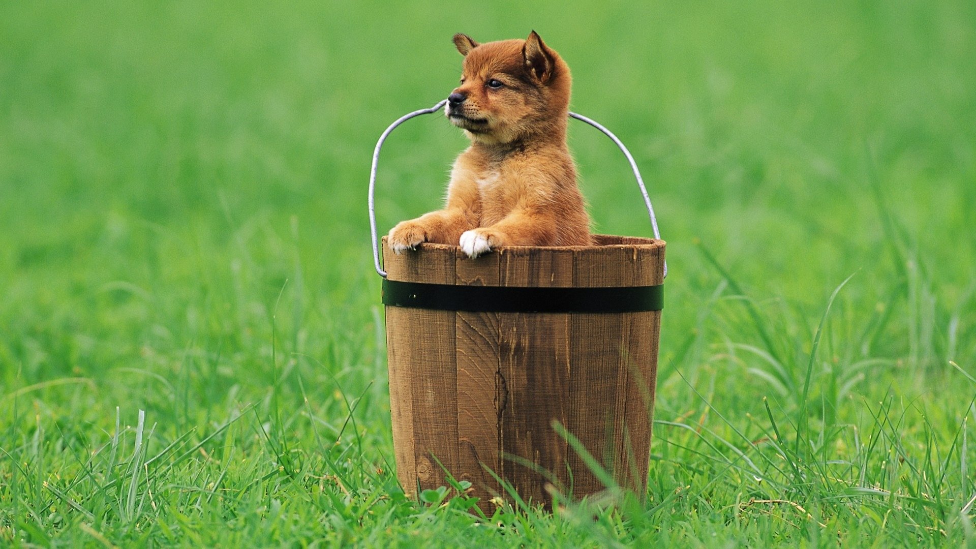 Ein welpe auf einer grünen wiese sitzt in einem eimerEin Welpe auf einer grünen Wiese sitzt in einem Eimer