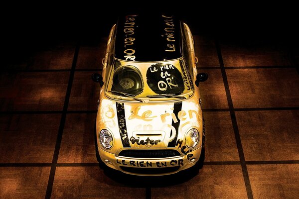 Bemalte Schubkarre steht auf dem Parkett