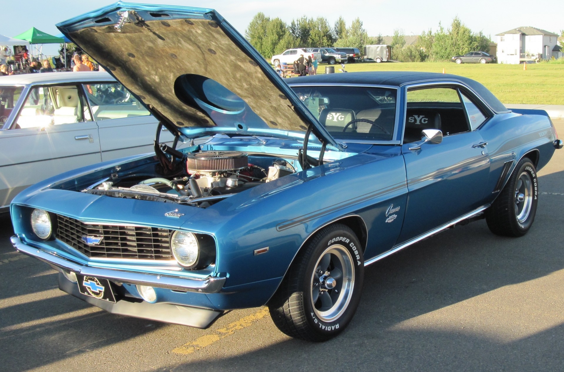 Blaues Auto mit geöffneter Motorhaube und schwarzem Streifen an der Karosserie