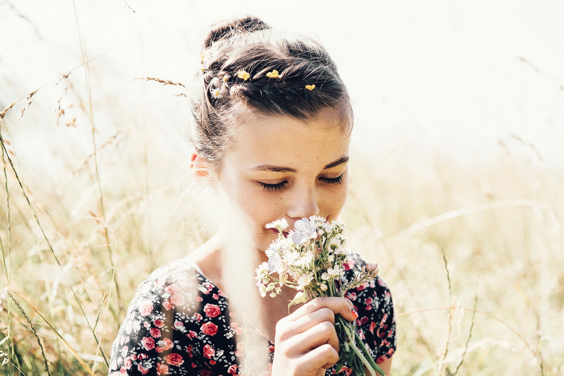 Mädchen im sommer im feld schnüffelt einen blumenstraußMädchen im Sommer im Feld schnüffelt einen Blumenstrauß