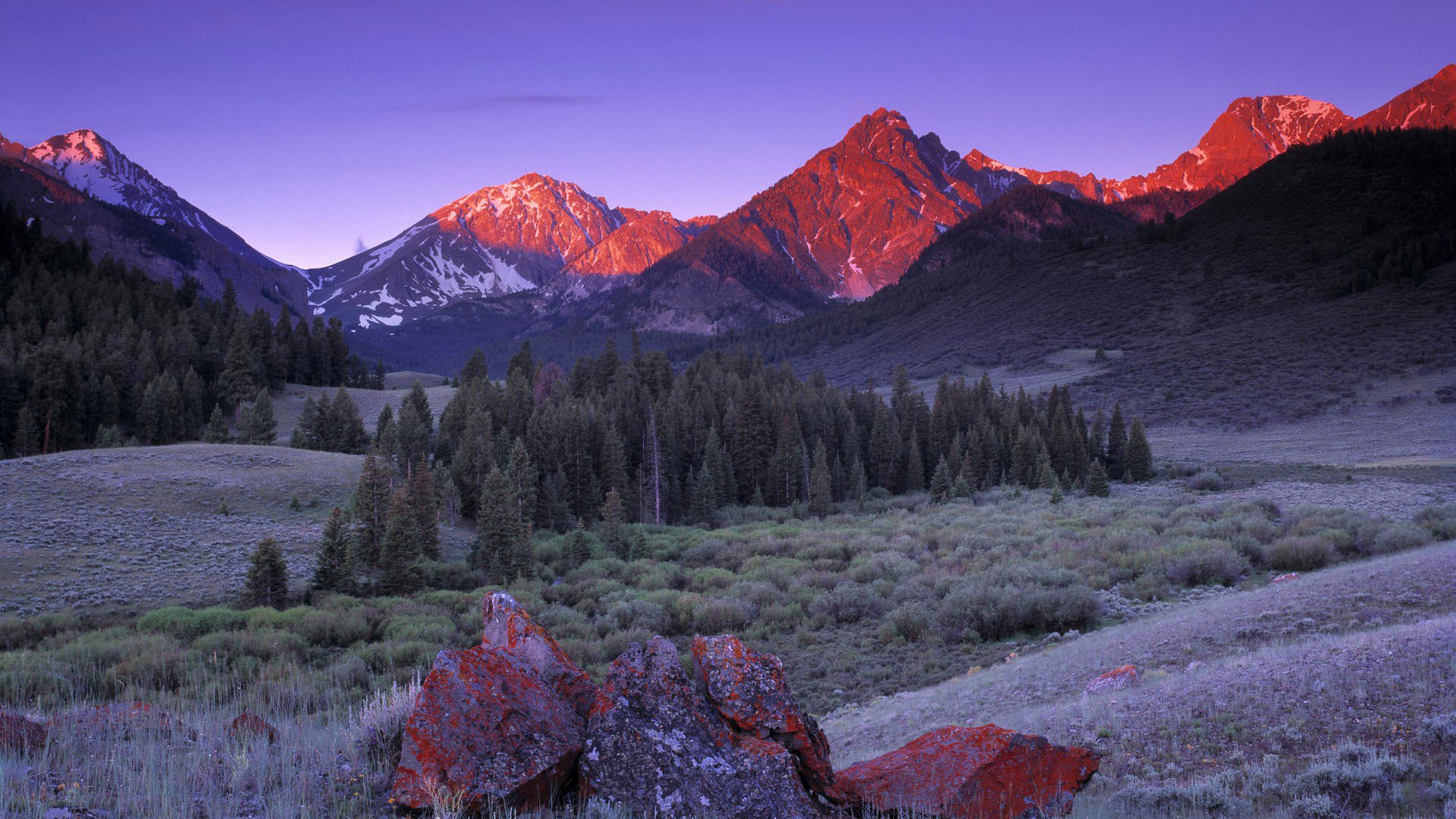 Die Berggipfel sind umgeben von majestätischen Tannen