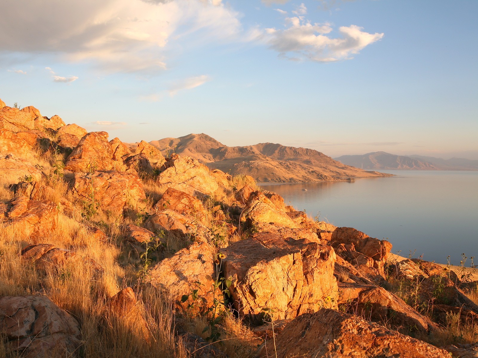 Sauberer Bergsee im Hintergrund des Sonnenuntergangs