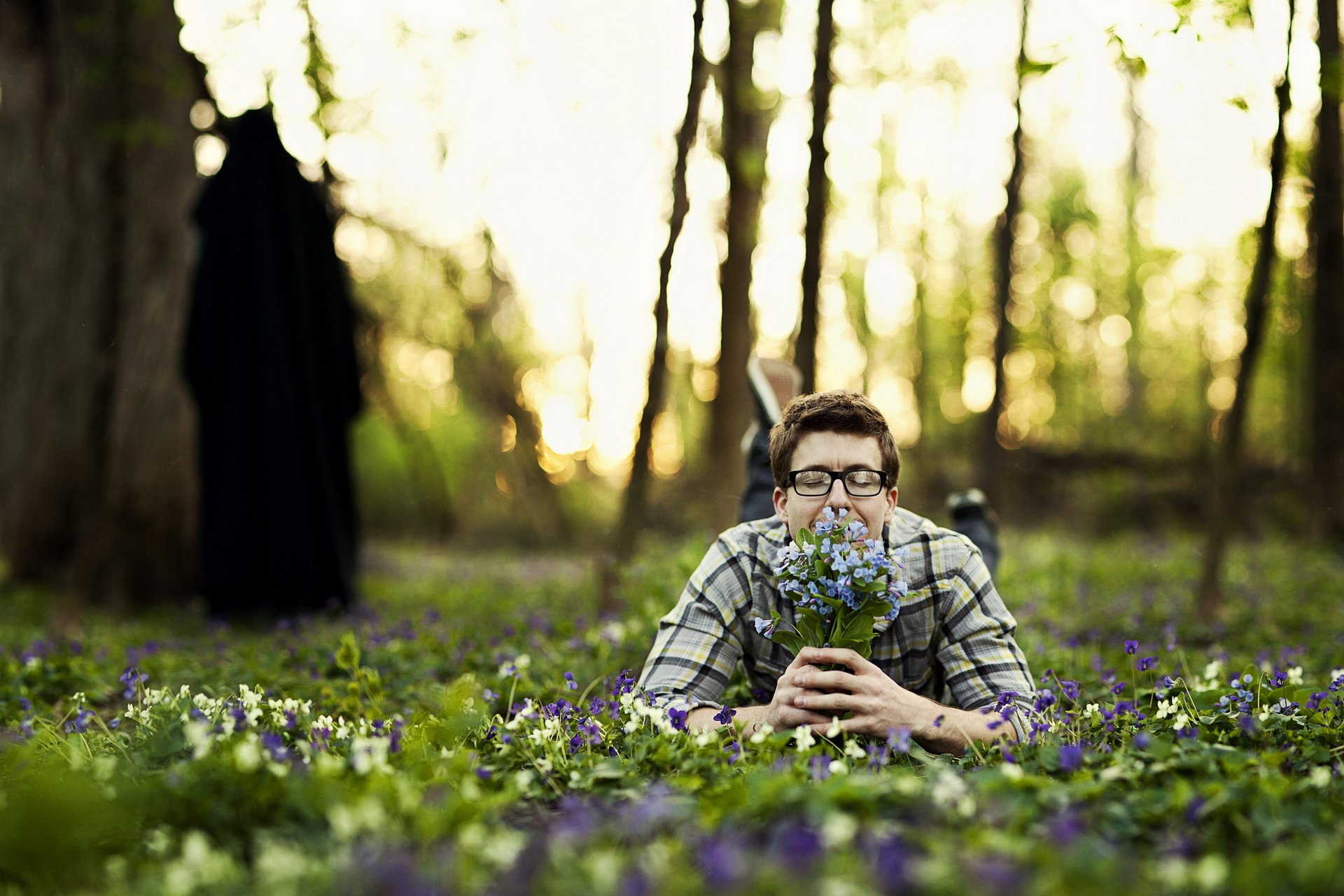 Ein Mann liegt mit einem Blumenstrauß auf dem Rasen