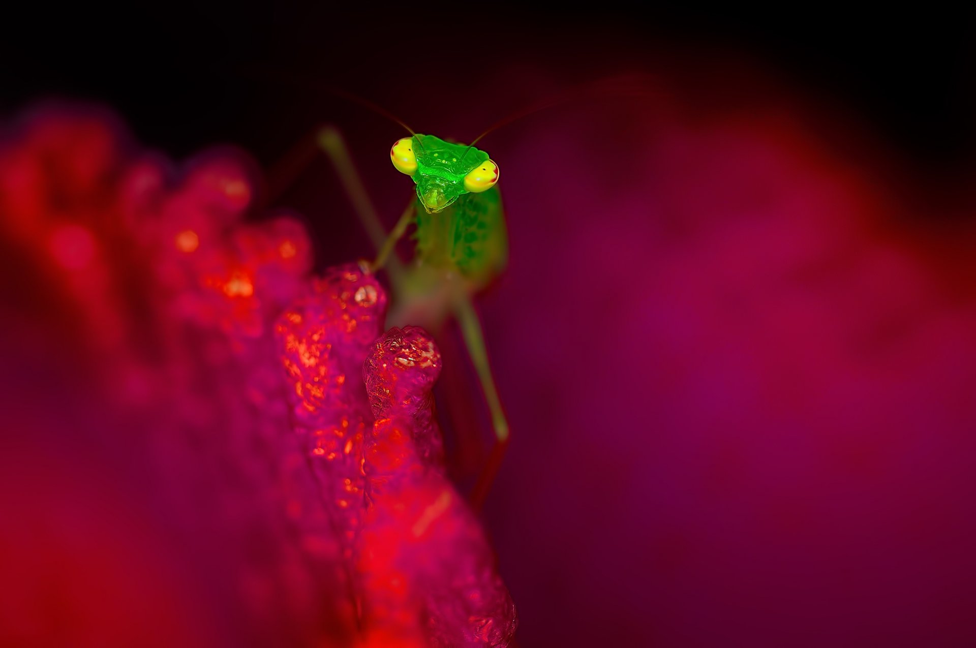 Auf einem rosa und orangefarbenen blütenblatt ein insekt mit ranken und pfotenAuf einem rosa und orangefarbenen Blütenblatt ein Insekt mit Ranken und Pfoten